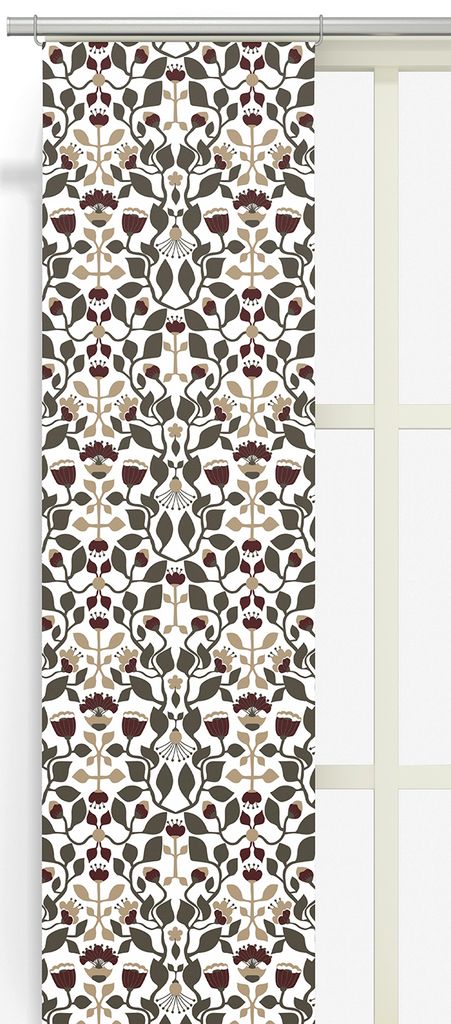 Blomstersnår brun panelgardiner förenar nordisk tradition med ett modernt formspråk. Här möter vi ett vackert ornamenterat blomster- och bladmotiv där mjuka bruna, beige och djupa röda toner skapar en naturlig och varm färgskala. Mönstret är symmetriskt uppbyggt och ger ett harmoniskt helhetsintryck samtidigt som de många detaljerna tillför djup och karaktär.