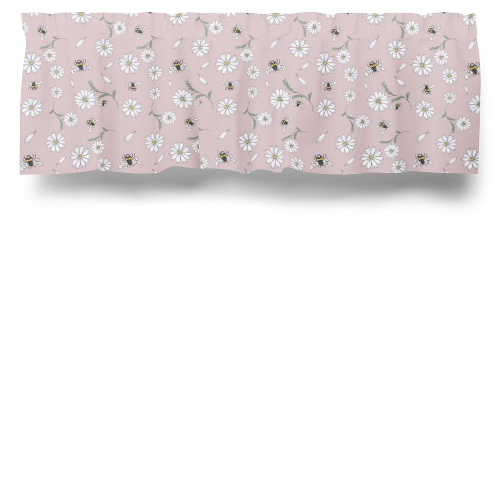 Gardinkappa på metervara med rosa botten och prästkragar och humlor. Kappan levereras ofållad i kanterna.