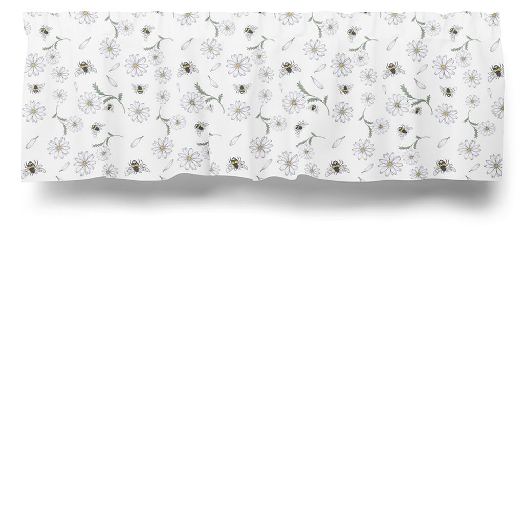 Gardinkappa på metervara med vit botten och prästkragar och humlor. Kappan levereras ofållad i kanterna.