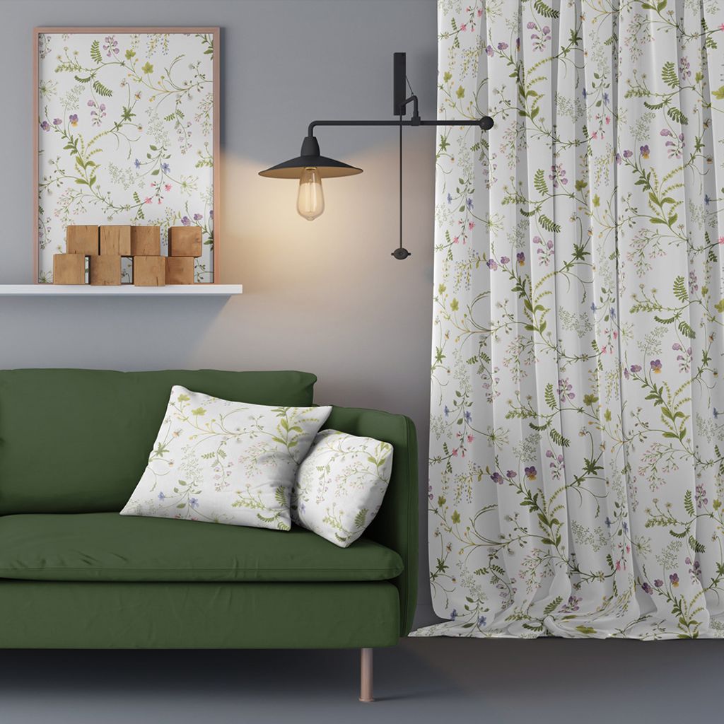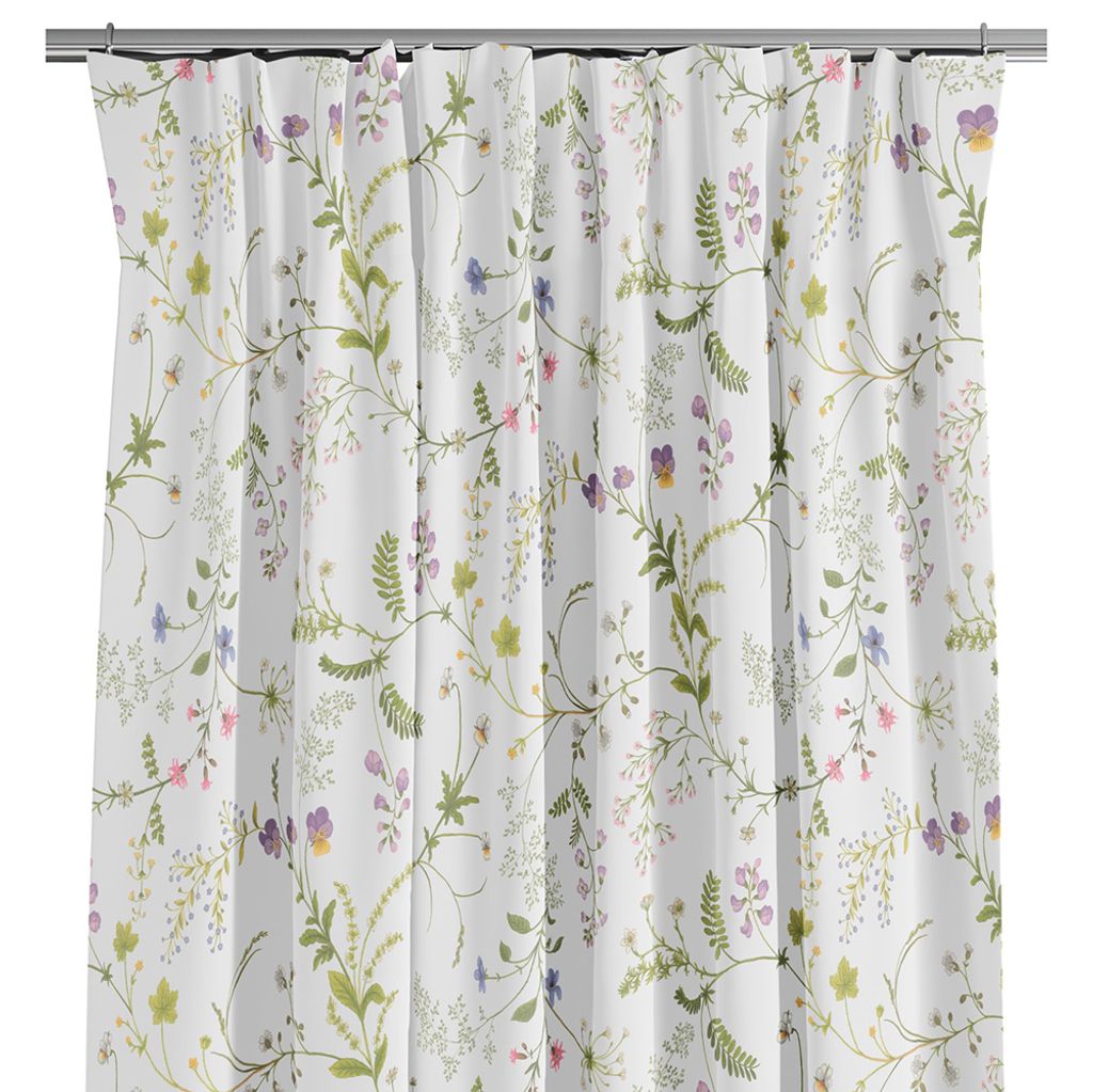 Snirkligt mönster med blad och blommor i milda färger. Mönstret är tryckt på Arvidssons klassiska bomullsvara som hänger fint som gardiner. Ouppfållade med overlock nedtill