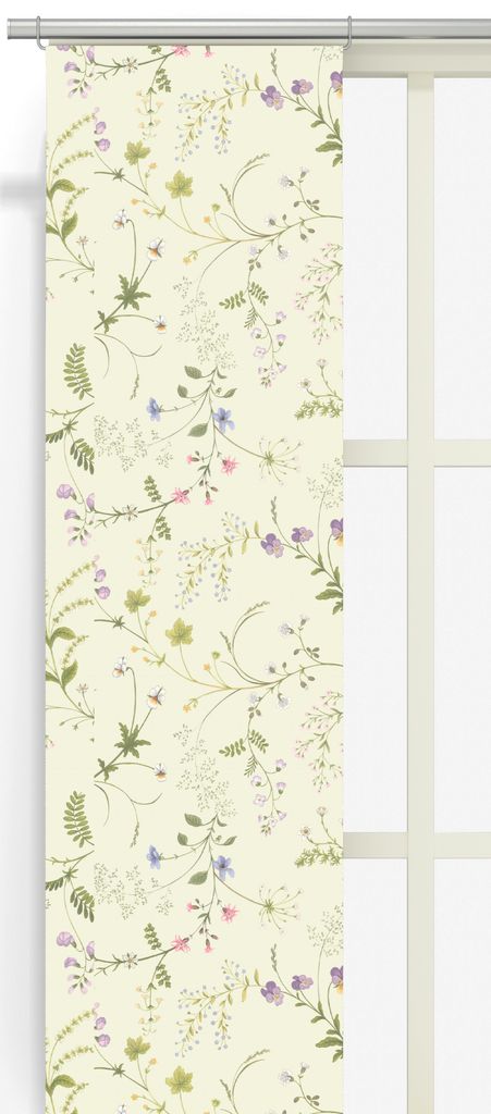 Ljuvliga mönstret av vilda ängsblommor i mjuka pastelltoner ger en romantisk och naturnära atmosfär. Den ljusa bakgrunden förstärker den luftiga och fräscha känslan, vilket gör denna gardin till ett perfekt val för att släppa in naturligt ljus samtidigt som den ger rummet en ombonad och elegant touch.