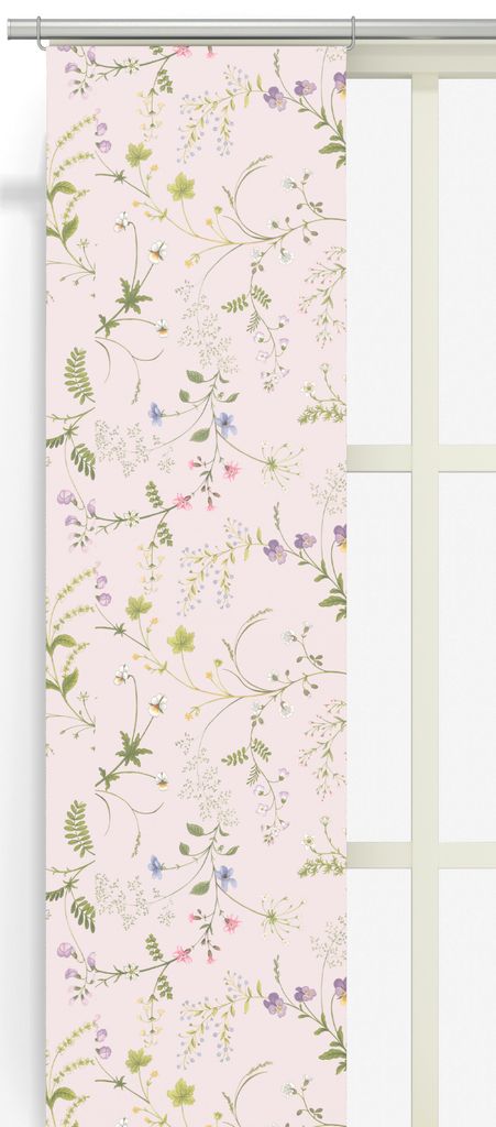 Ge ditt hem en romantisk och naturnära touch med vår Blomsteryra rosa panelgardin i en mjuk rosa nyans. Det detaljrika mönstret av vilda ängsblommor i fina pastellfärger skapar en lugn och harmonisk atmosfär.