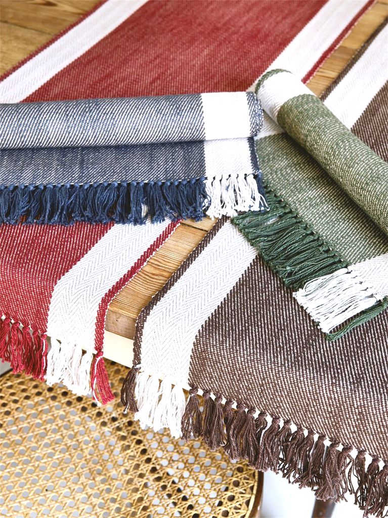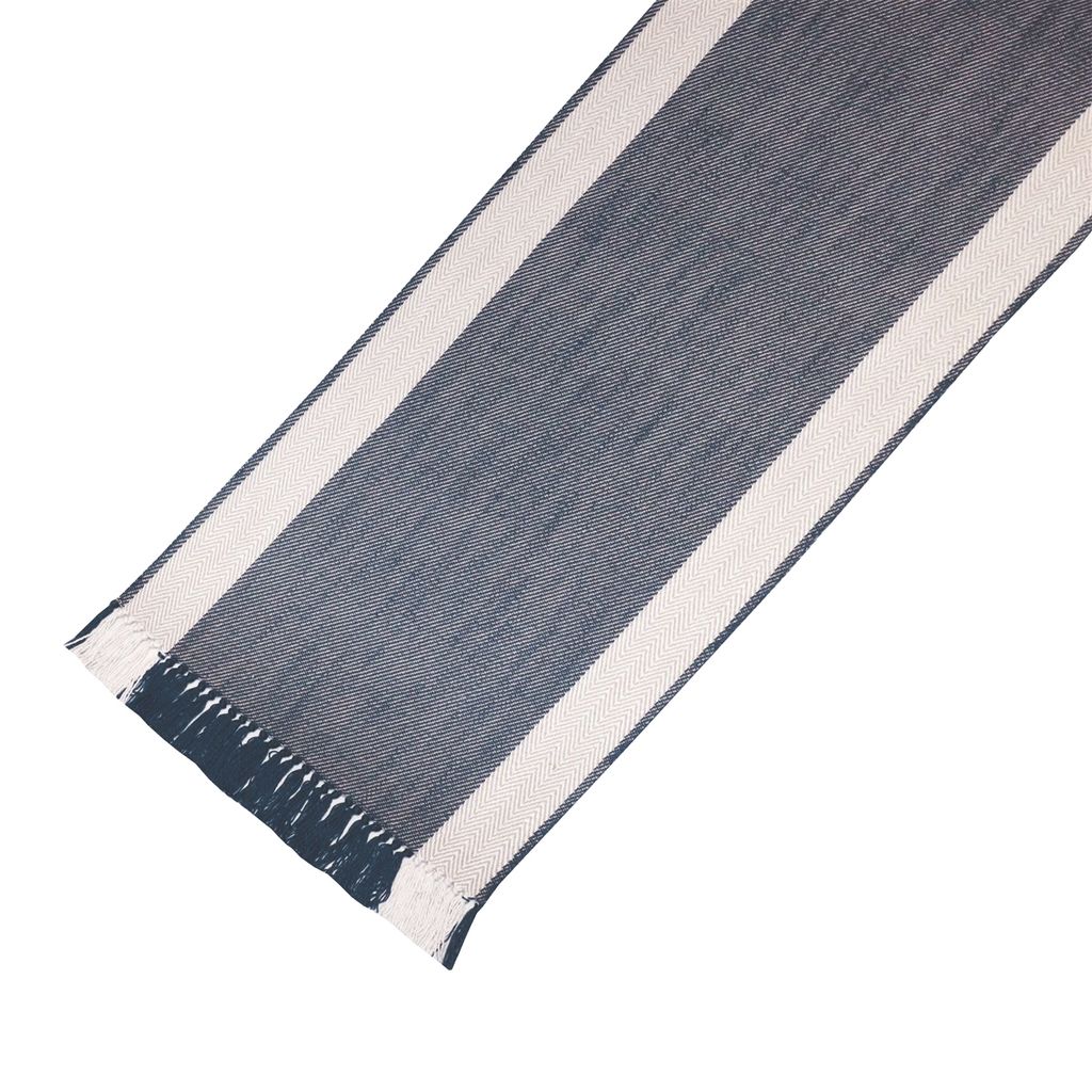 En elegant bordslöpare i mörkblått, med fiskbensdetaljer och fransar. Perfekt för att skapa en stilfull och lugn känsla på ditt bord.