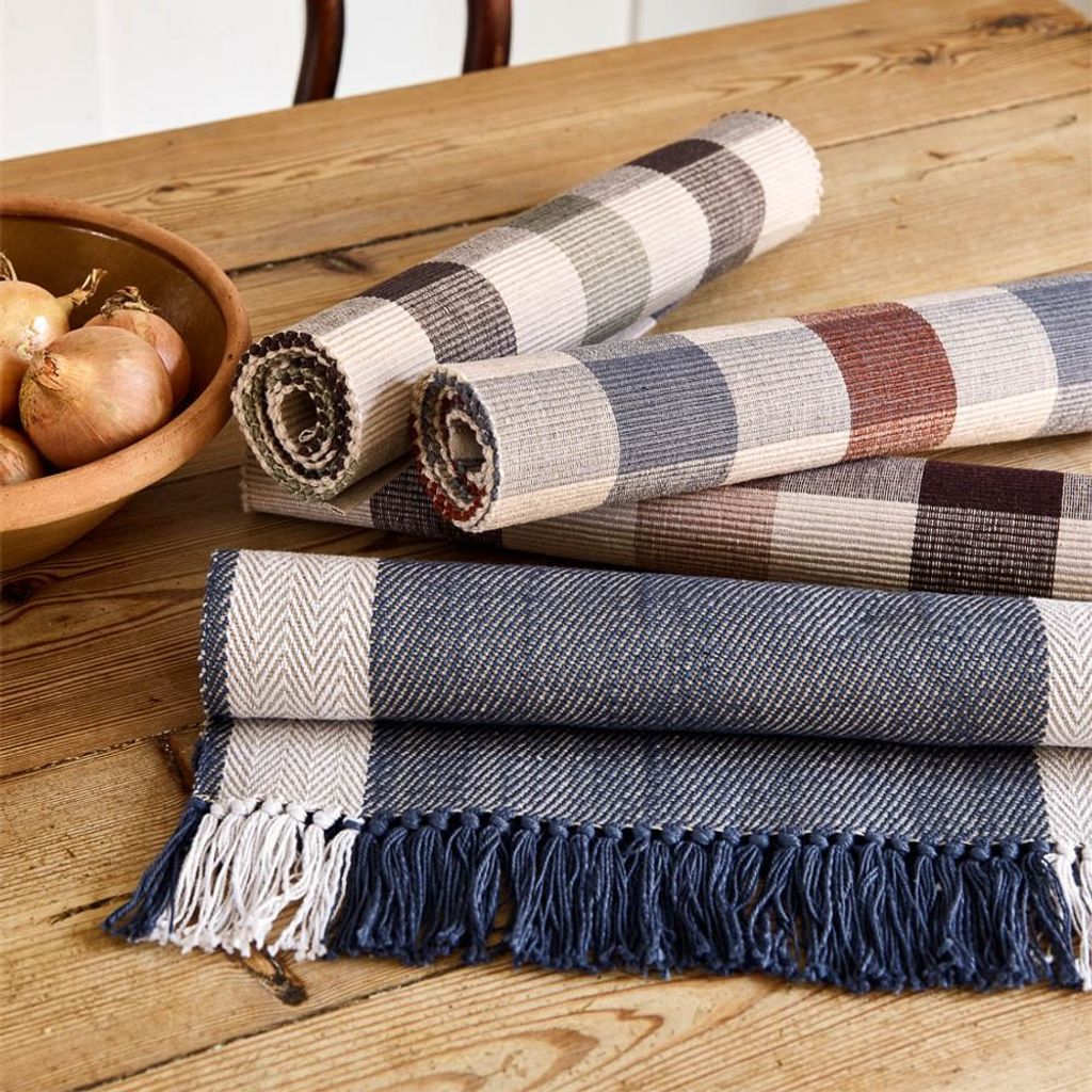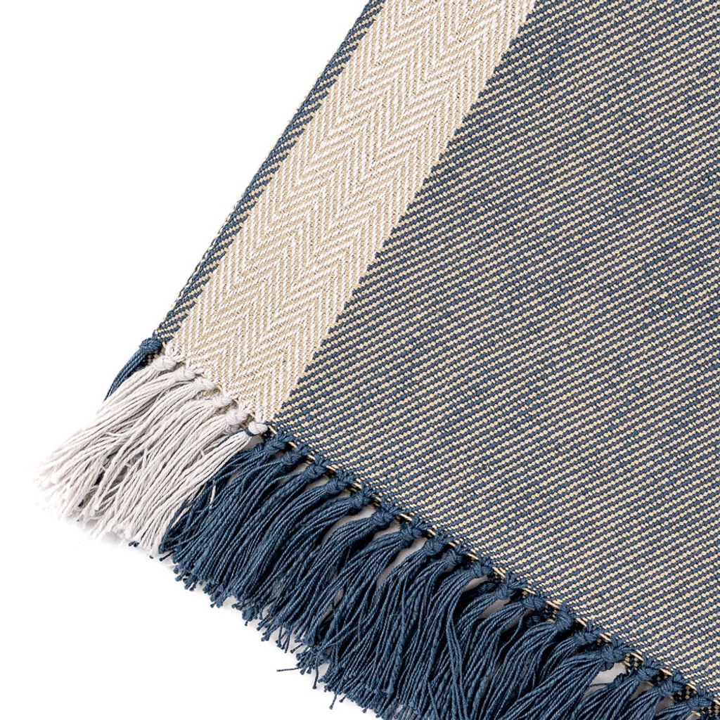 Beskrivning av Bordslöpare Emilia blå – Fiskben & fransar i bomull
