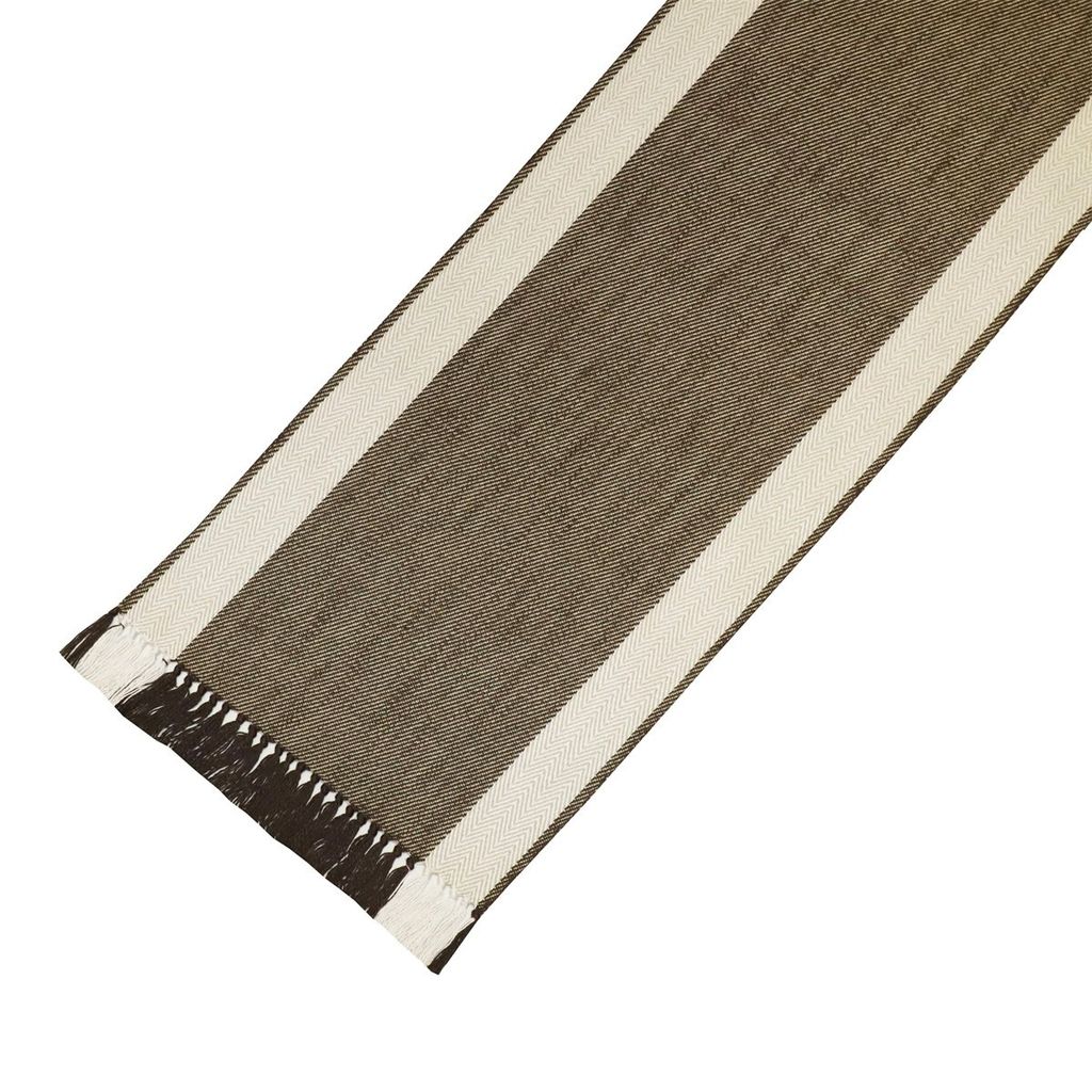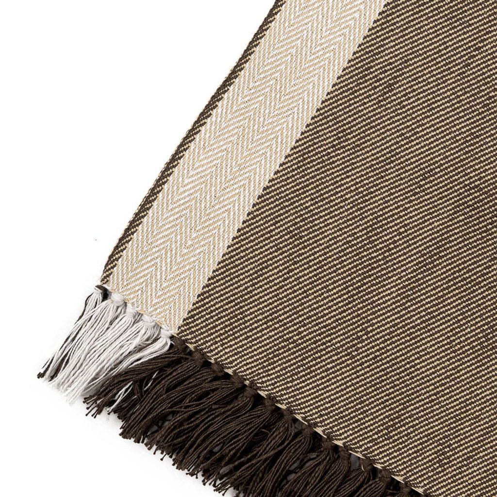 En elegant brun bordslöpare med fiskbensdetaljer och fransar. Perfekt för att ge en mjuk och stilfull känsla till din dukning.