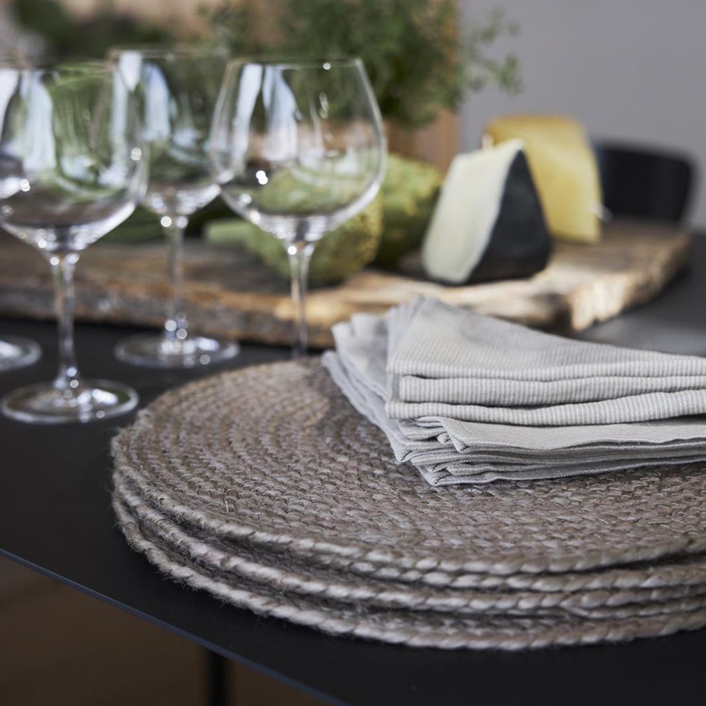 Rund grå/beige bordstablett i vacker flätad design. Vacker som tallriksunderlägg vid speciella duknings tillfällen men även till vardags. Tillverkat i 100% Jute.OBS! pga. naturmaterial så kan denna vara skilja i färg från underlägg till underlägg.