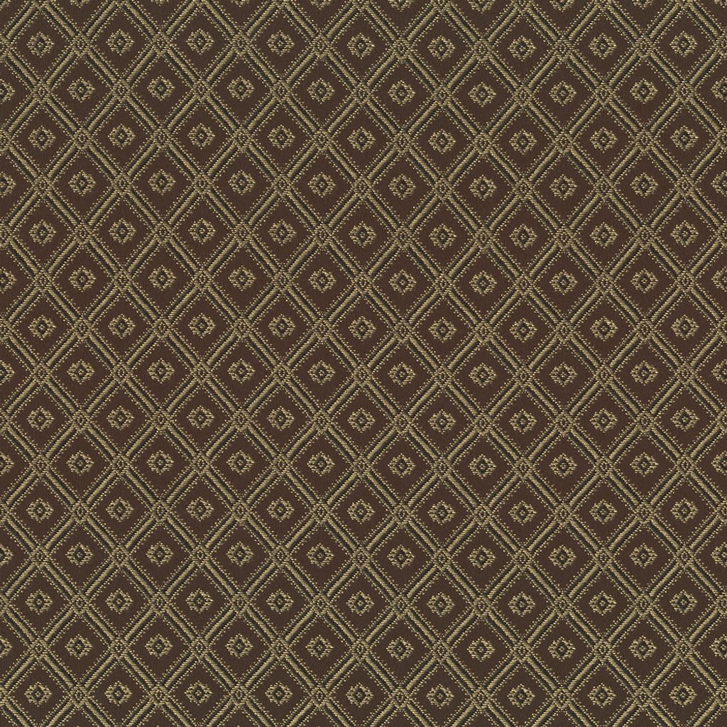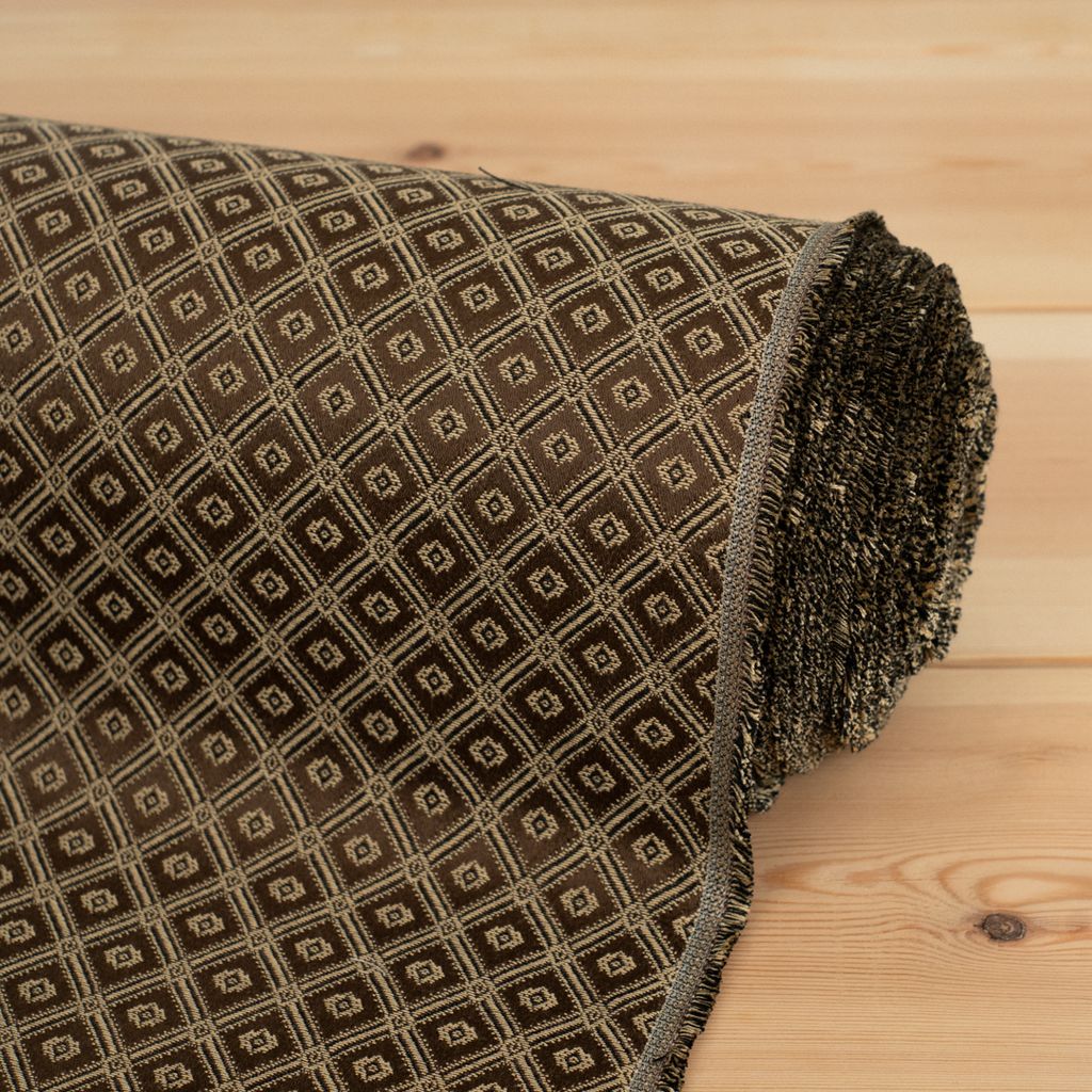 Tyget är vävt och har ett mönster i brunt, svart och guld.