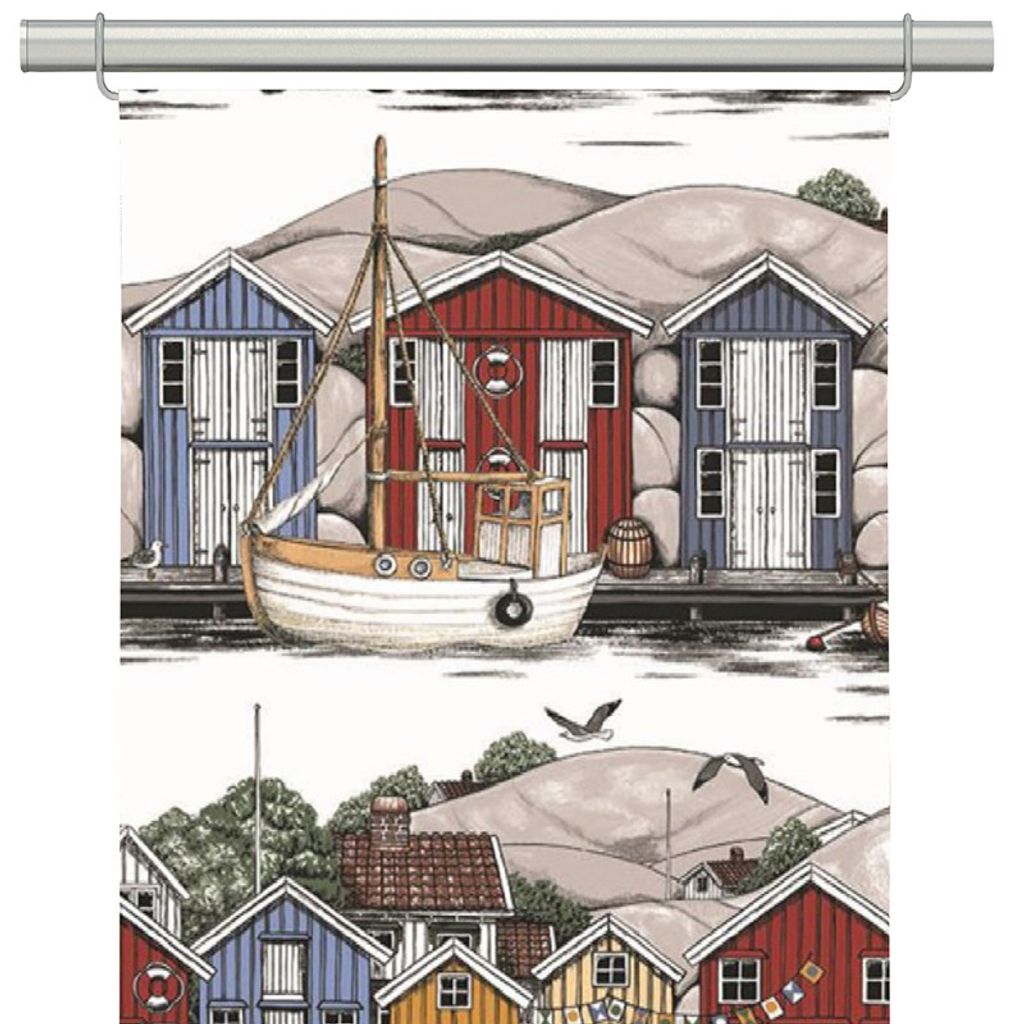 Beskrivning av Bryggviken panelgardiner med Smögens sjöbodar