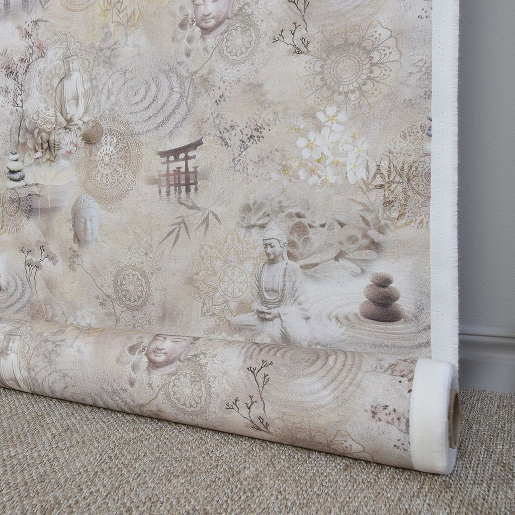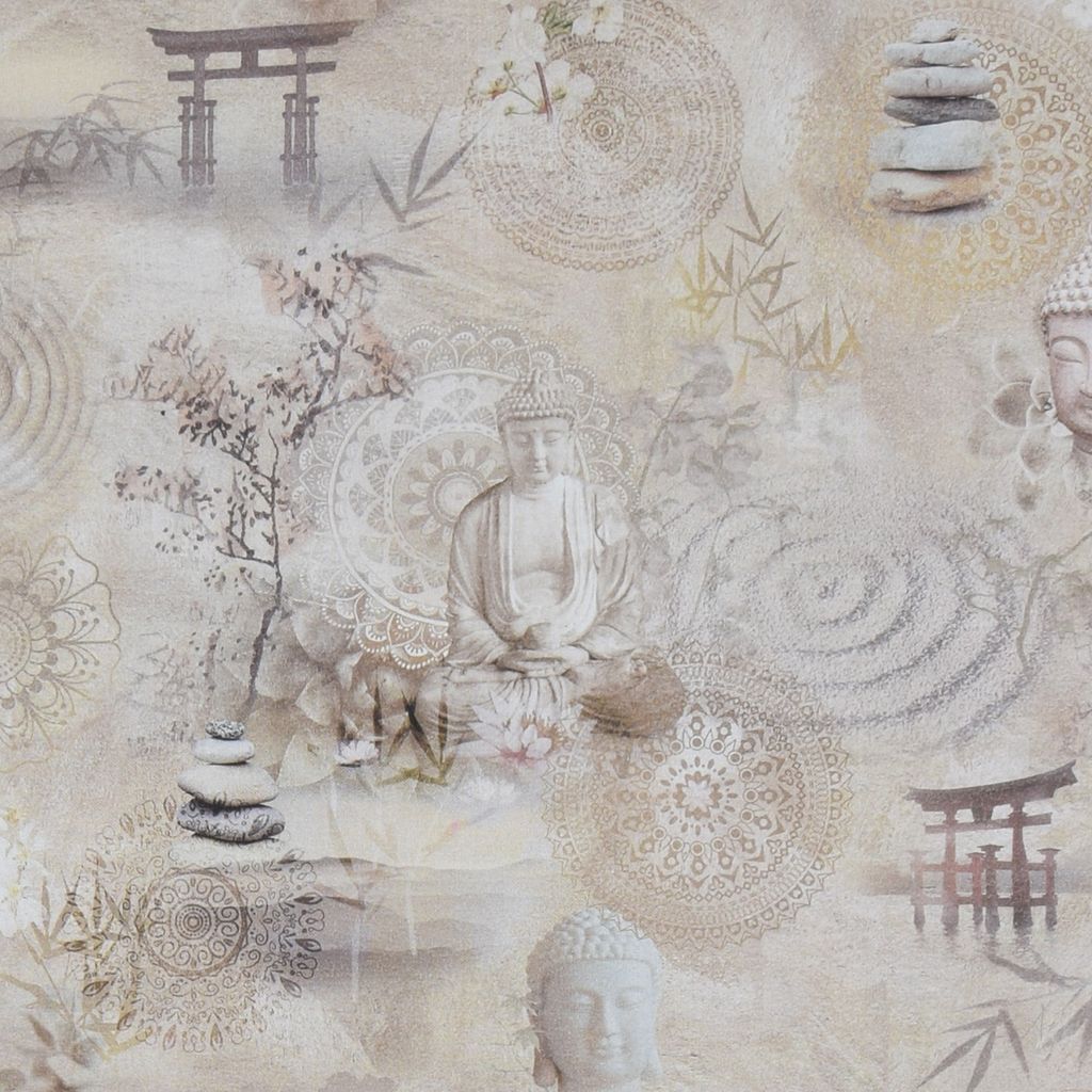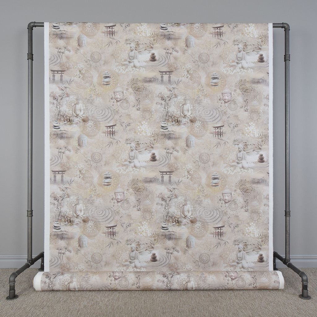 Beige tyg med lunga färger och fina motiv med växer, mandala, Zen och Yoga för gardiner och inredning.