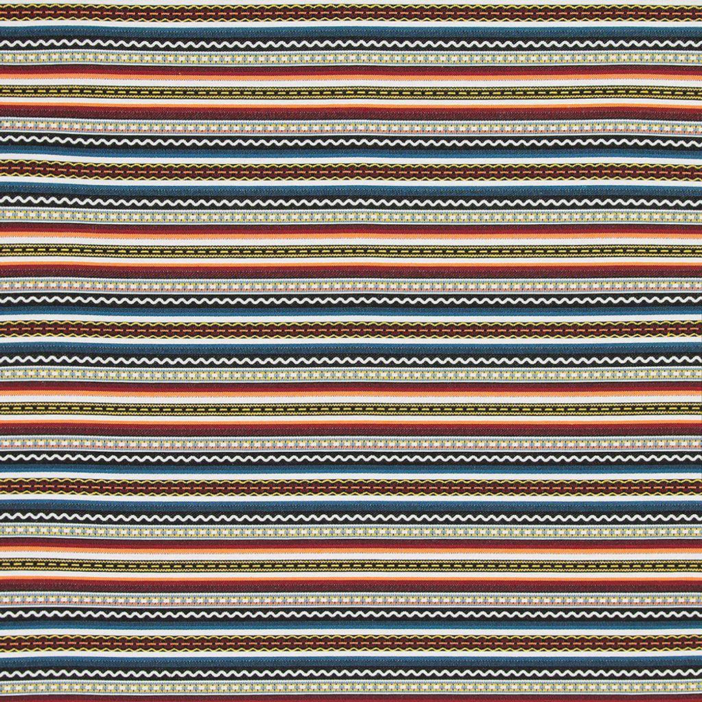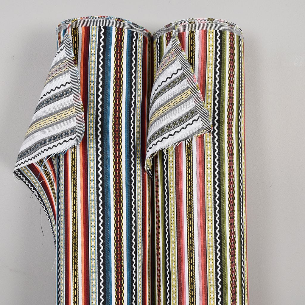 Cadiar blå-orange är ett detaljrikt jacquardvävt tyg med traditionellt inspirerat randigt mönster i djupa nyanser av blått, orange, vitt och gult. Vävt i slitstark bomullsblandning, perfekt för gardiner, möbelklädsel eller textila inredningsdetaljer.