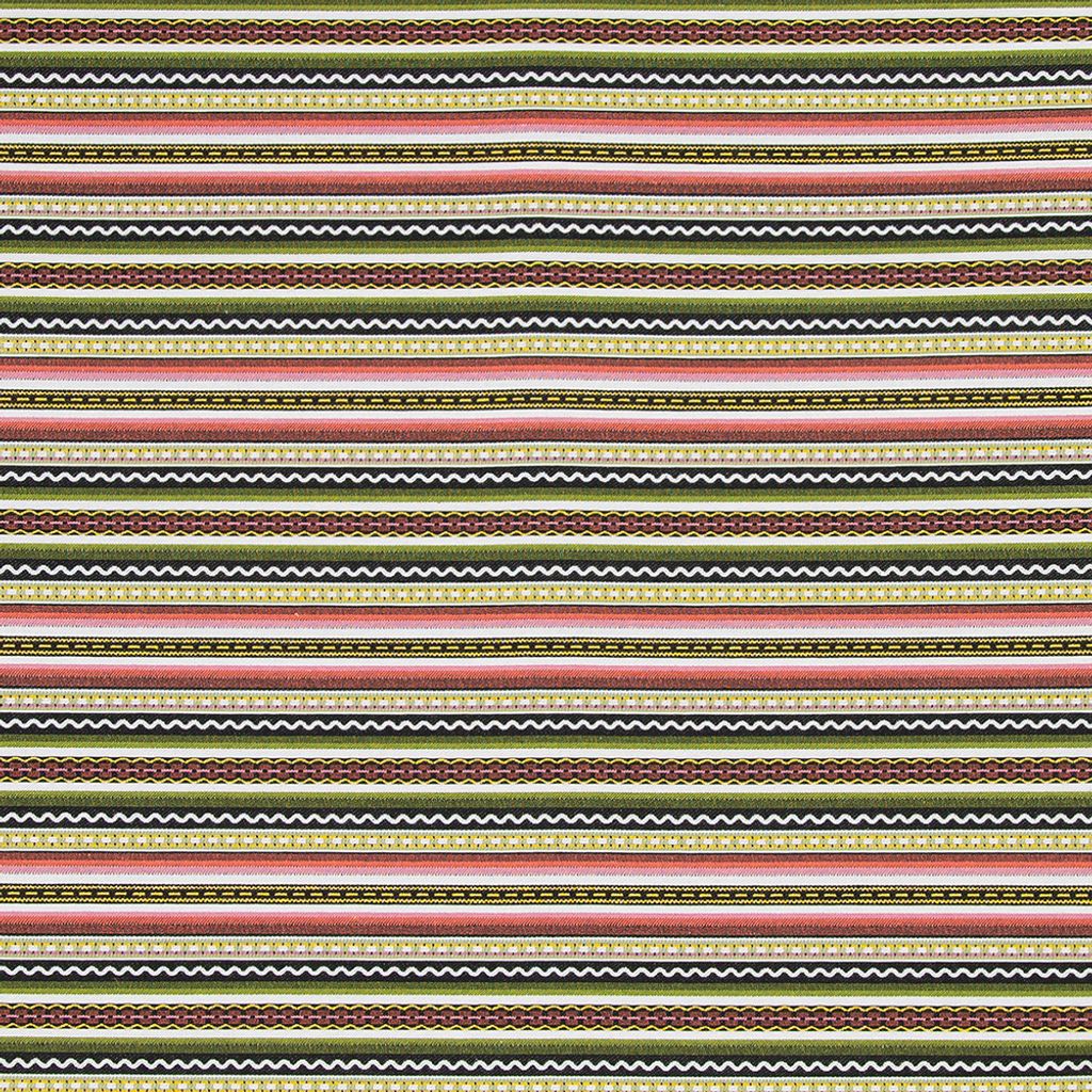 Cadiar grön-rosa jacquardtyg kombinerar klassiska ränder med en modern färgsättning i nyanser av grönt, rosa, rött och vitt. Mönstret har en rik variation av detaljer såsom zickzackband och smala, stiliserade bårder, vilket skapar en dynamisk och levande design.