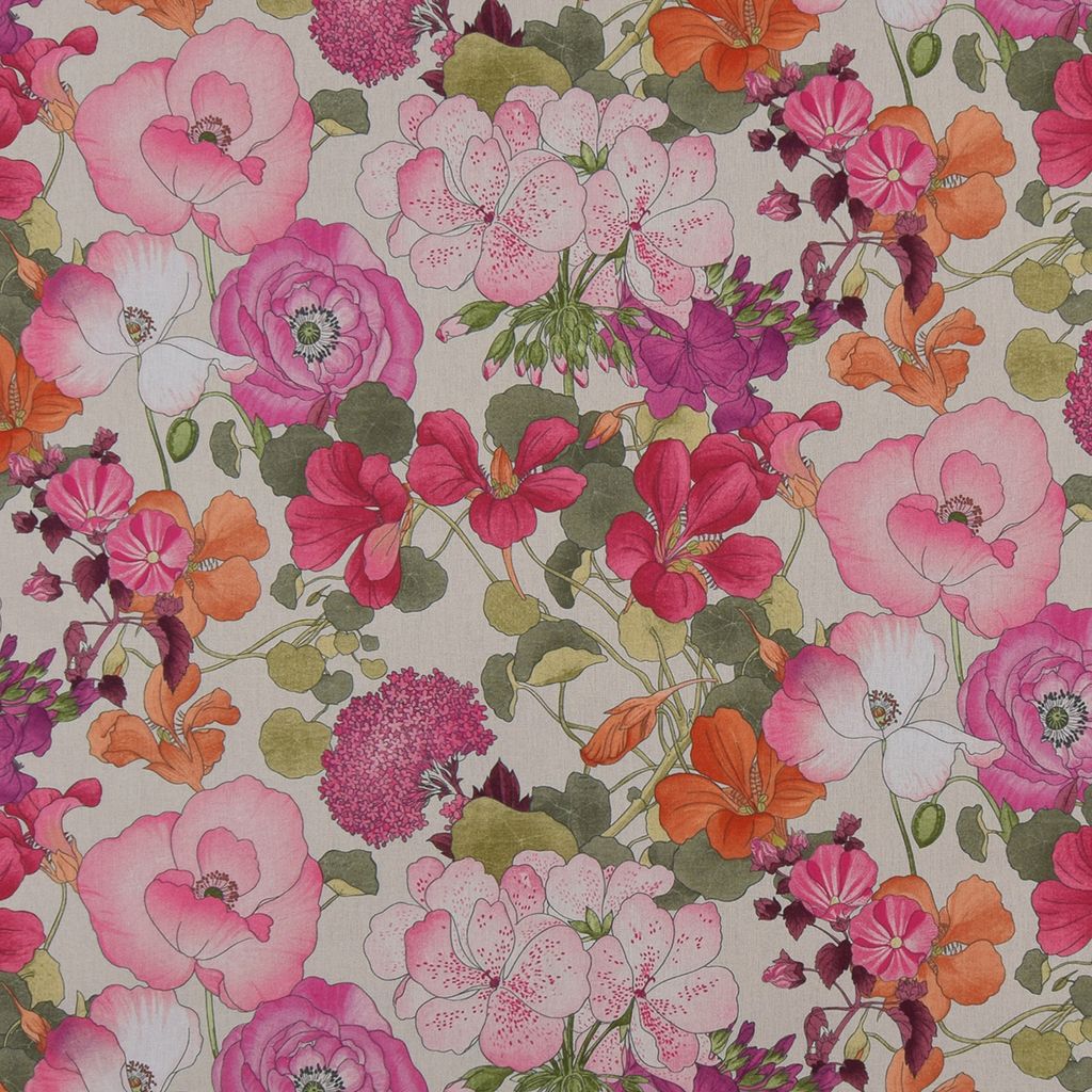 Capucine rosa är ett charmigt gardintyg med ett uttrycksfullt blommönster i rosa, fuchsia och orange toner. Ett tyg som fångar uppmärksamheten och för in naturens färgrikedom i ditt hem.