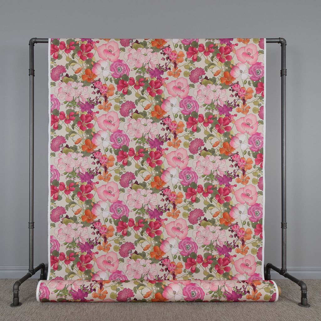 Mönstret är tryckt på ett mjukt men slitstarkt bomullsblandat tyg med en lätt struktur som ger liv och djup åt färgerna. Med sitt frodiga blomstermotiv ger Capucine rosa en känsla av sommar året runt.