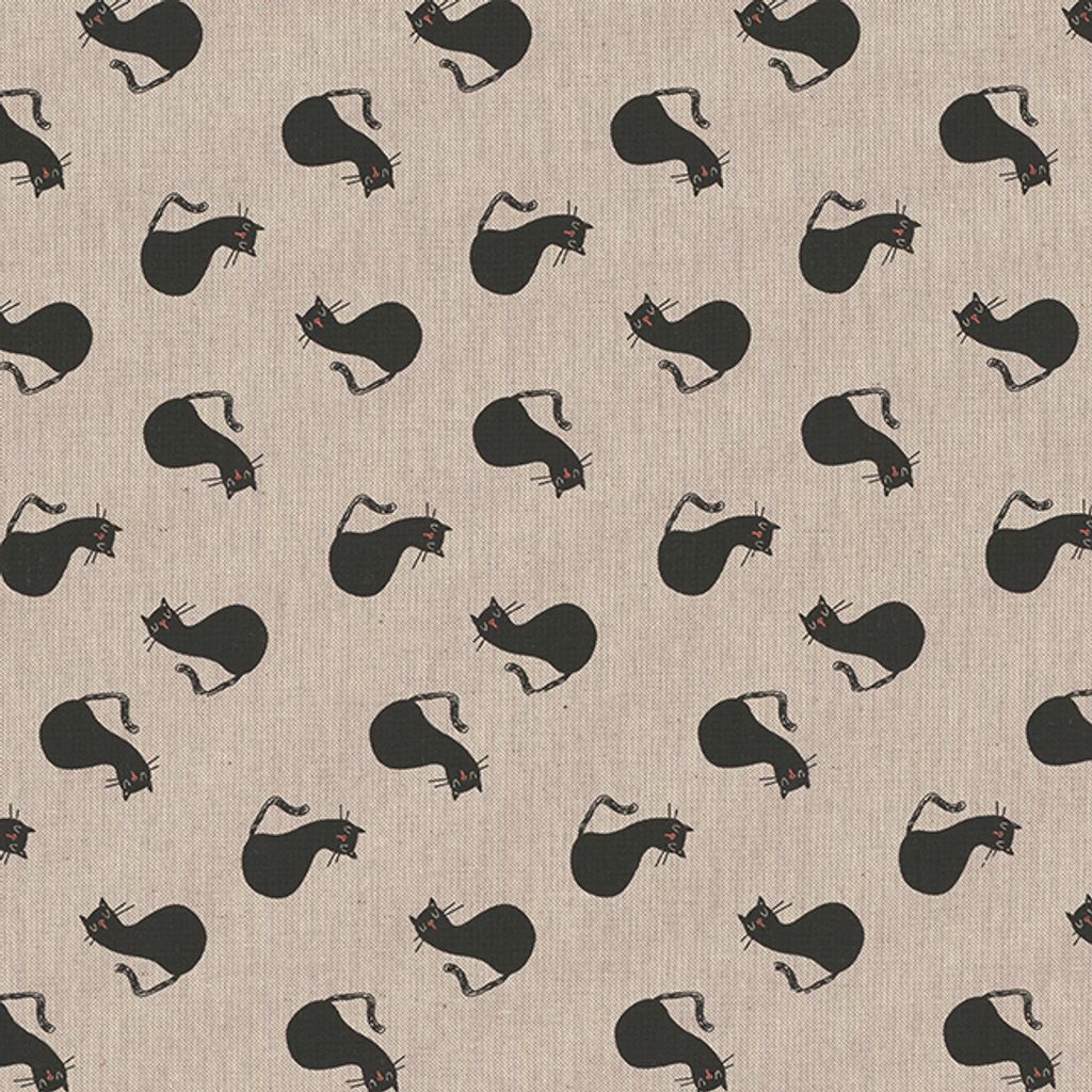 Tyg för gardiner och inredning med linnelock och motiv av svarta katter.