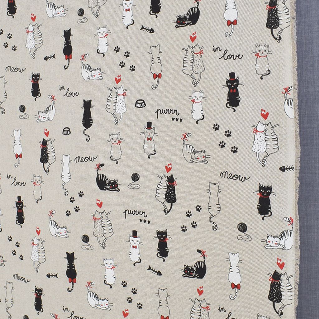 Tyg för gardiner och inredning med linnelock och motiv av katter