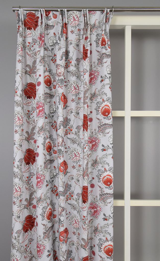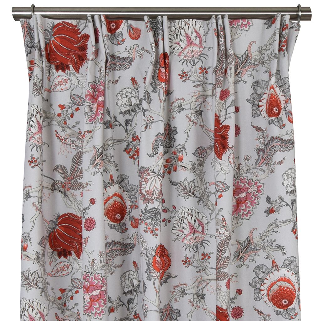 Ceylan grå, vackra gardiner med stora blommor i rött mot en ljusgrå botten.