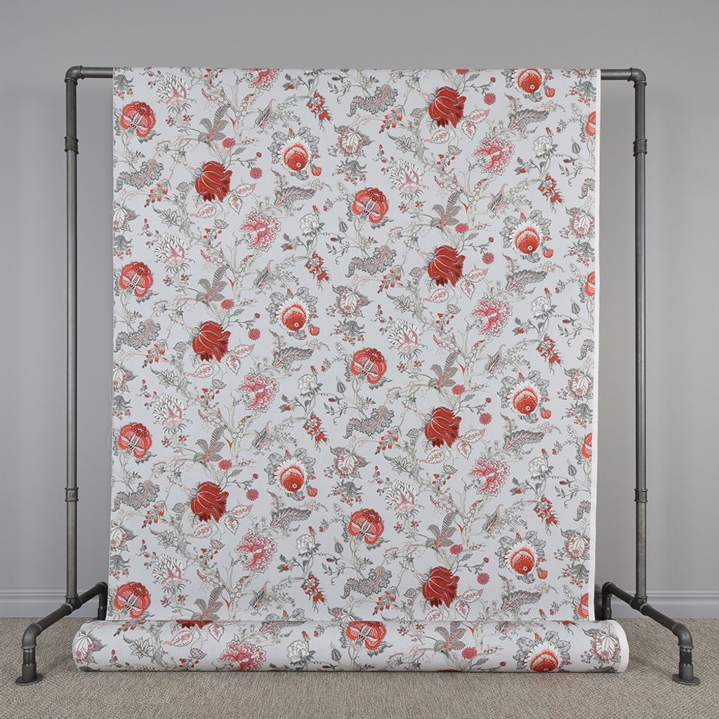 Elegant och romantiskt kvalitetstyg i 100% bomull i grå bas med röda blommor.