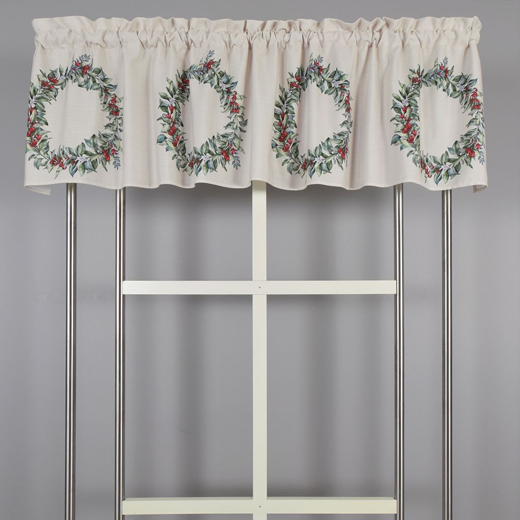 Gardinkappan har ett kransmotiv med grönt blad och röda bär på en ljus bakgrund, vilket ger en mjuk och inbjudande känsla. Säljs på metervara, så att du kan anpassa längden efter dina behov. En gardinkappa som passar bra till både julen och resten av vintersäsongen. När man räknar på hur lång kappa man behöver så brukar man ta fönstrets mått gånger 1,3 till 1,5 beroende på hur mycket rynk man vill ha.