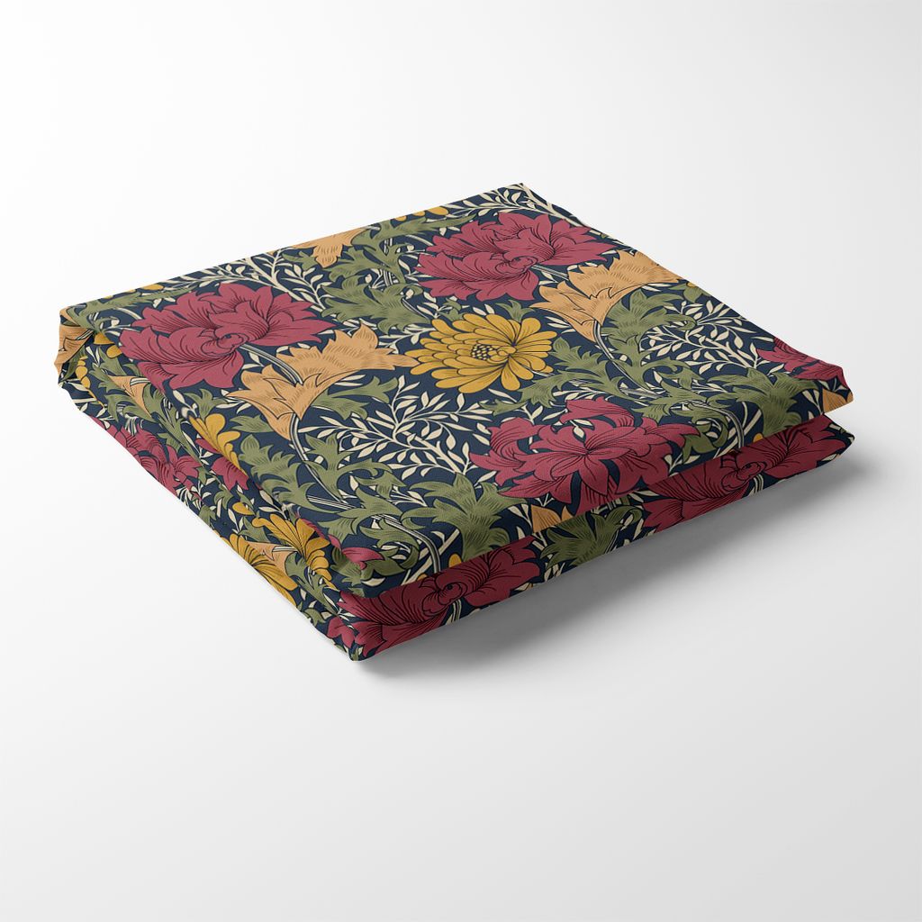 Skapa en tidlös och elegant atmosfär vid ditt matbord med Chrysanthemum Bloom bordsduk. Mönstret är inspirerat av den klassiska arts & crafts-rörelsen och pryds av stiliserade krysantemum i djupa nyanser av rött och guld, omgivna av slingrande bladverk i en harmonisk färgpalett. Den mörka bakgrunden ger en vacker kontrast och framhäver blommornas detaljerade design.