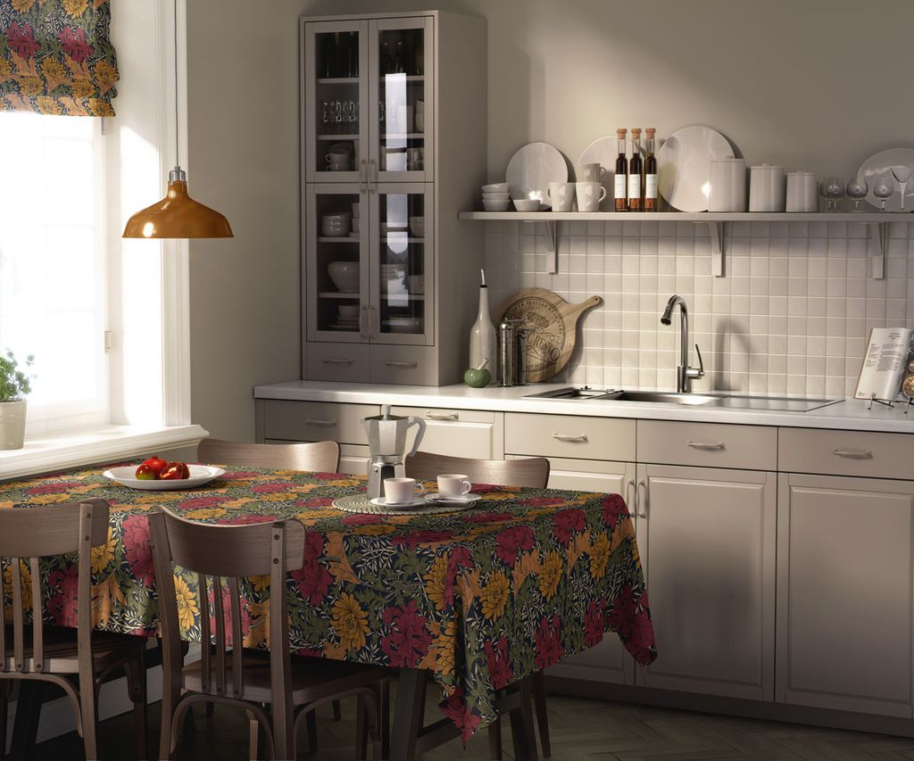 Chrysanthemum Bloom bordsduk kombinerar klassisk arts & crafts-design med ett levande blommönster i varma nyanser av rött, guld och grönt. Perfekt för att skapa en elegant och inbjudande dukning både till vardags och fest.