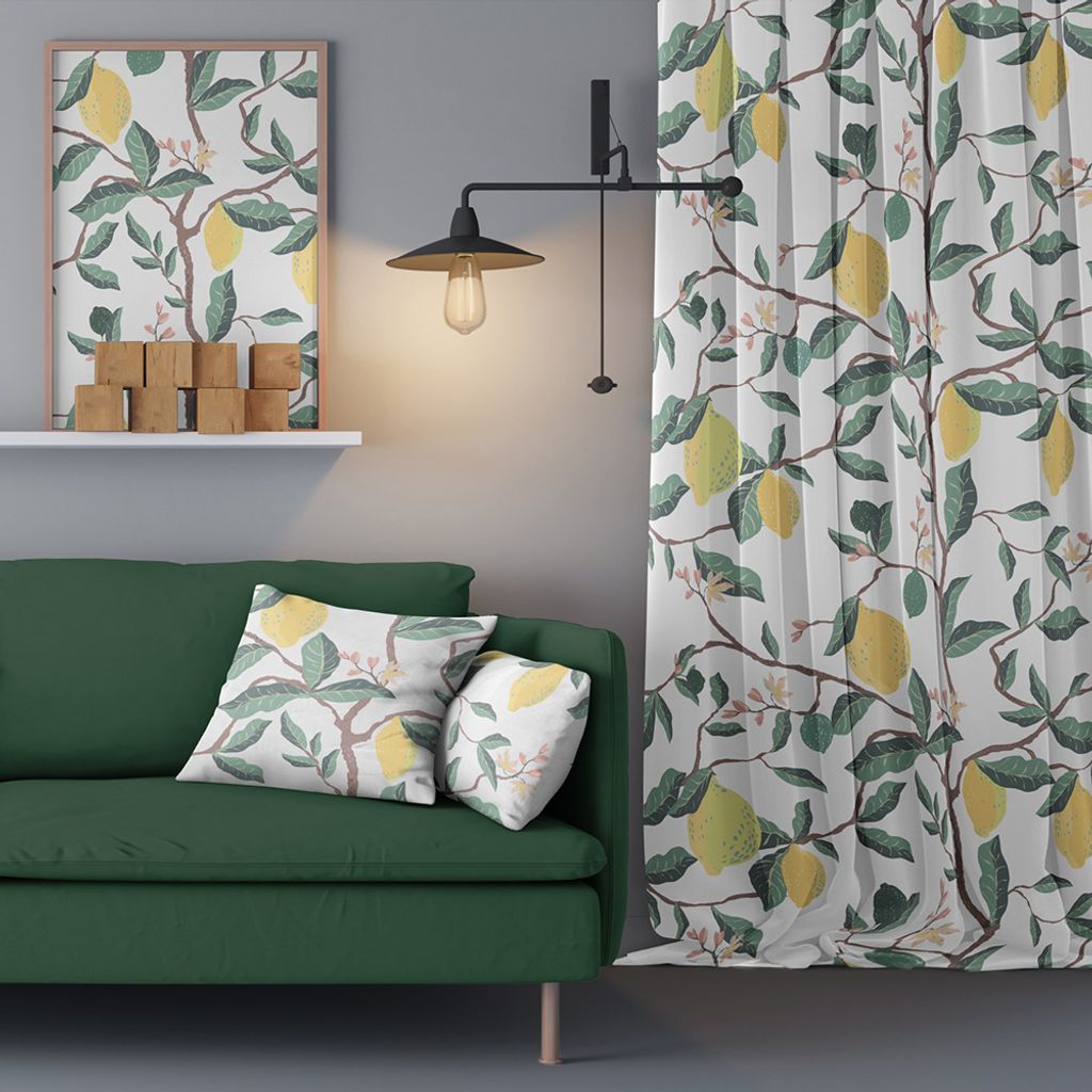 Blommande citronträd och stora gula citroner med gröna blad. Mönstret är tryckt på Arvidssons klassiska bomullsvara som hänger fint som gardiner. Ouppfållad med overlock nedtill