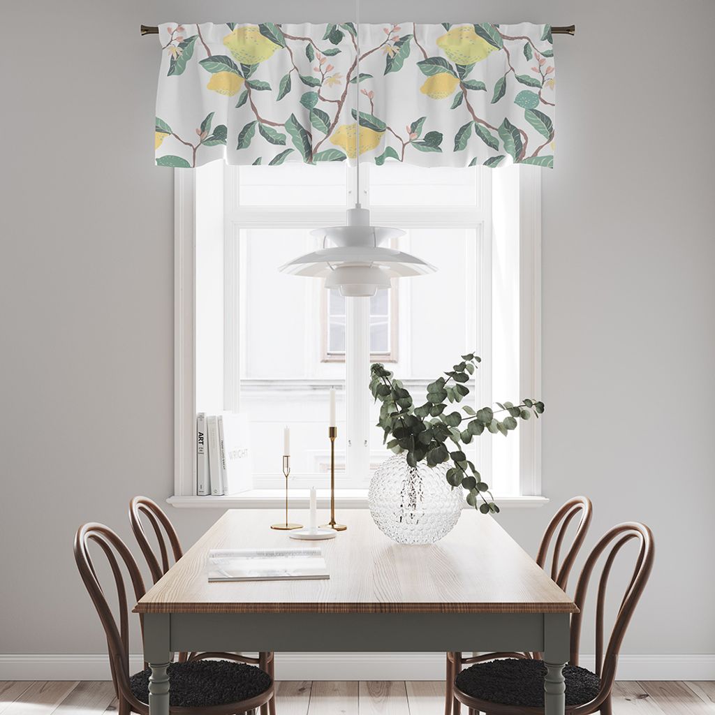 Gardinkappa på metervara med multiband och ofållade sidor. Blommande citronträd med gula citroner och vackra blommor. Kappan är 55cm hög.
