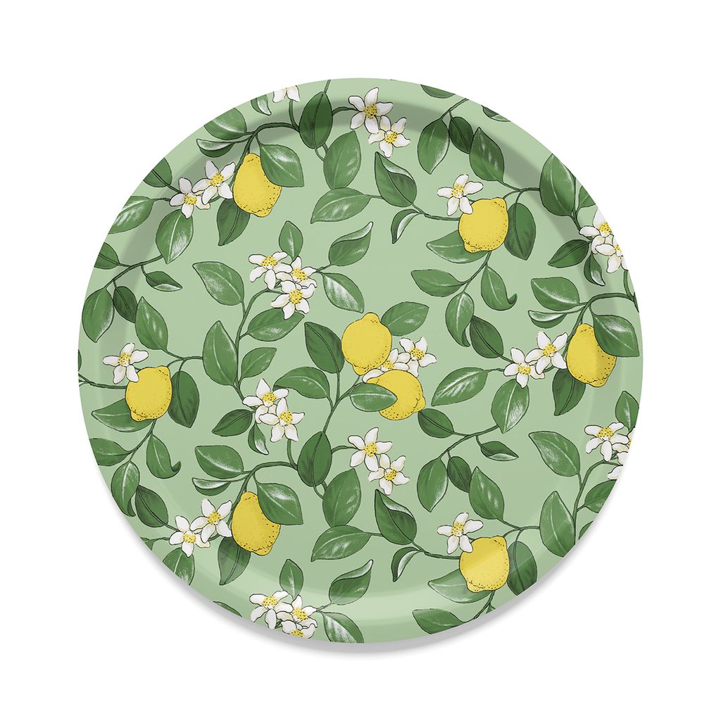 Citronlycka grön rund bricka bjuder på en frisk och livfull känsla med sitt dekorativa blomstermönster av solgula citroner, blommande kvistar och mjukt gröna blad mot en ljusgrön bakgrund. Motivet för tankarna till soliga trädgårdar och medelhavsinspirerade miljöer, samtidigt som färgskalan är lugn och lätt att kombinera i hemmet.