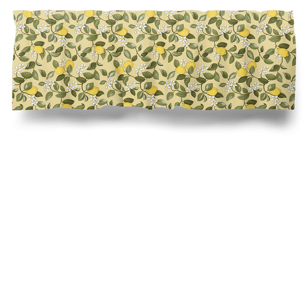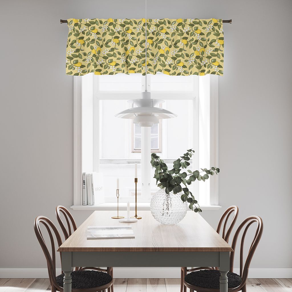 Citronlycka gul gardinkappa på metervara ger ett friskt och levande uttryck med sitt mönster av citroner, gröna blad och små vita blommor mot en varm gul botten. Perfekt för att skapa en ljus och inbjudande känsla i kök eller matplats.