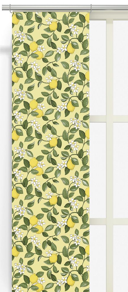 Citronlycka gul panelgardiner har ett livfullt citronmönster i gult, grönt och vitt mot en mjuk ljusgul botten. Ett fräscht och dekorativt inslag som ger rummet en lätt och somrig känsla.