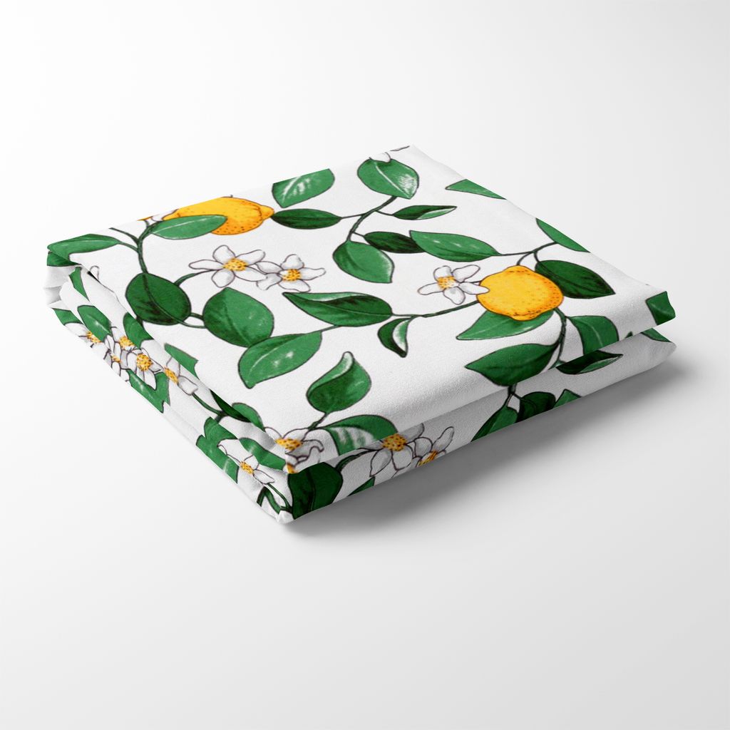 Bomullstyg med Citronlycka vit med ett härligt mönster av citroner, på ett citronträd i blom. Mönstret är handritat av Mialotta Arvidsson-Mars. Duken finns i 3 olika storlekar.