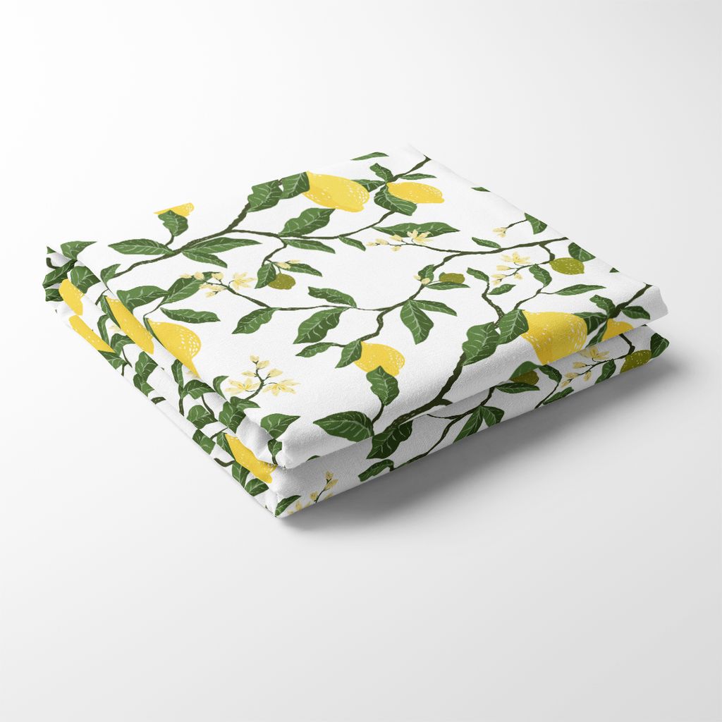 Citronträd gul bordsduk är en ljus och inbjudande bordsduk med citroner, gröna blad och små blommor på vit botten – perfekt för kök och matplats med en somrig känsla.