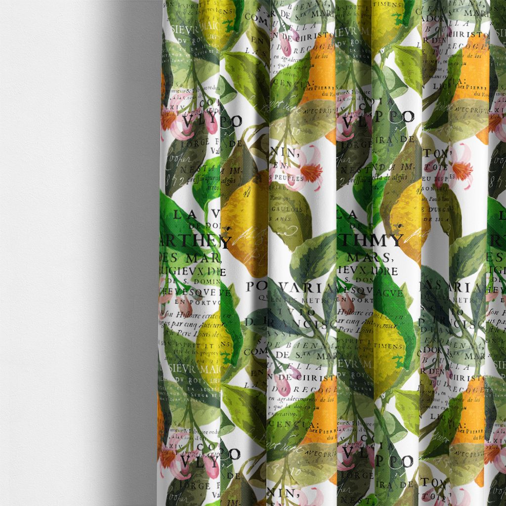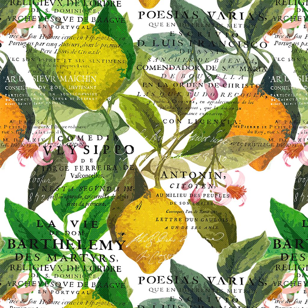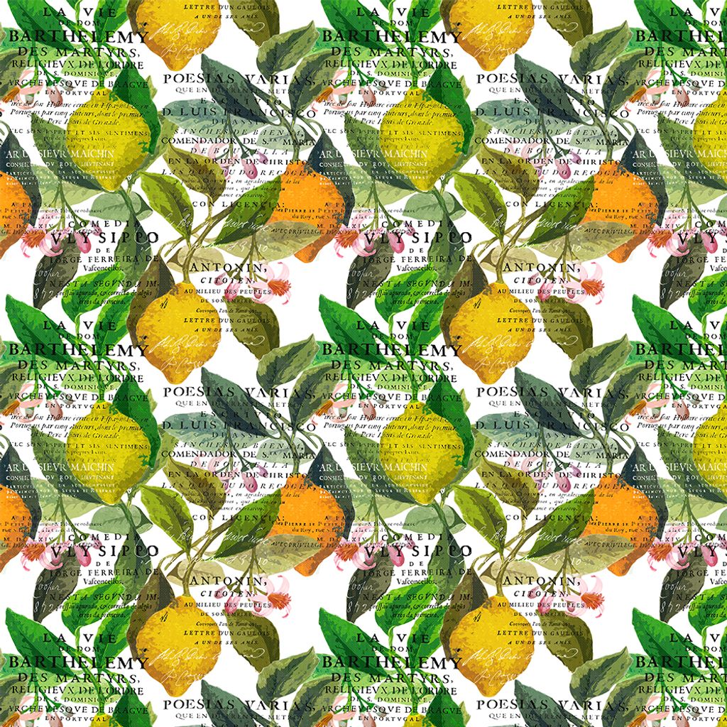 Citrus offwhite tyg bjuder på en frisk och ljus design med färgstarka citrusfrukter, grönskande blad och vintageinspirerade texter mot en elegant offwhite bakgrund. Ett perfekt val för att skapa en fräsch och sofistikerad atmosfär.