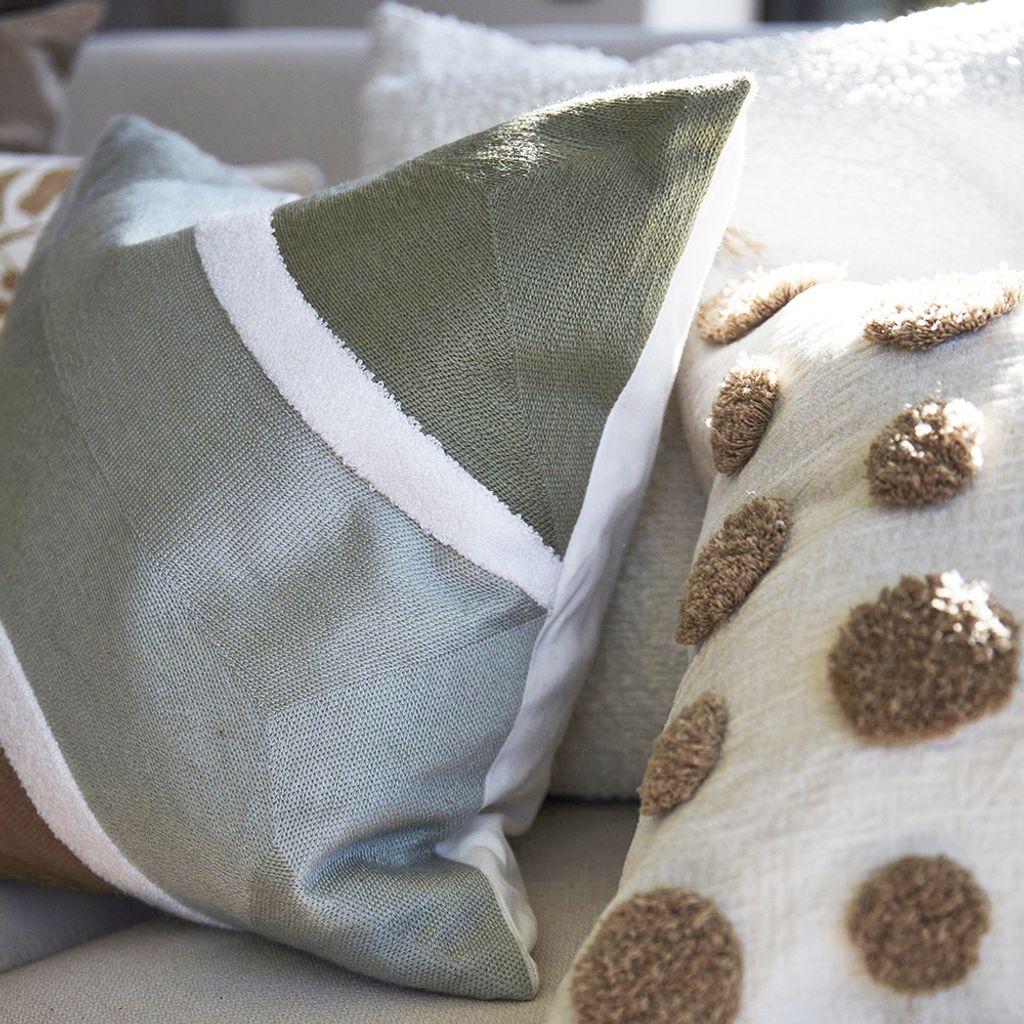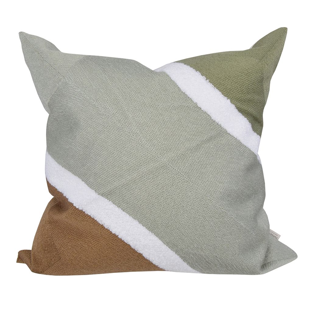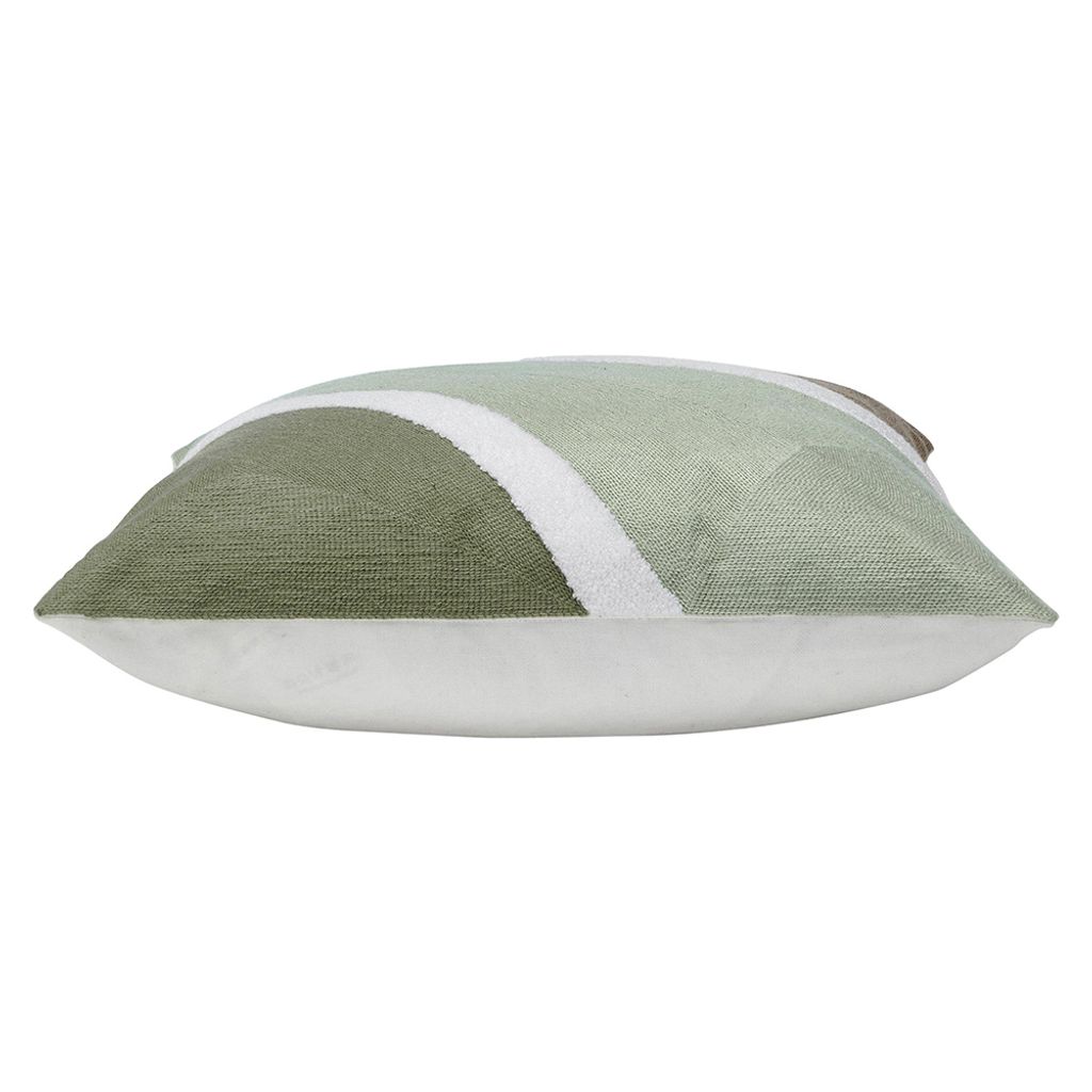 Mönstrat kuddfodral med broderat mönster på framsidan i grönt, brunt och vitt, enfärgad vit baksida. Dragkedja i nederkant. Mått 45x45cm.
