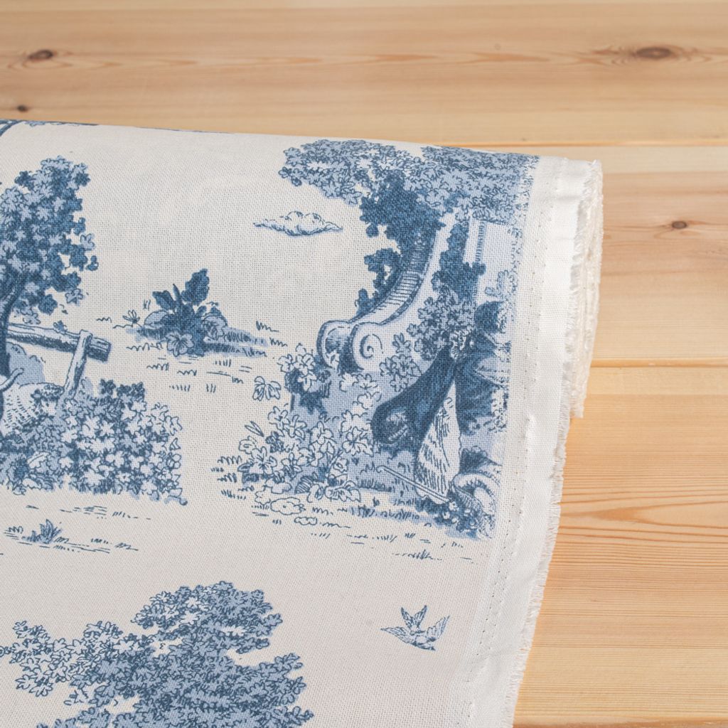 Idealiskt för att skapa dukar, kuddar och gardiner. Det detaljerade pastorala , blå och beige nyanser motivet ger en klassisk och elegant känsla till ditt hem.