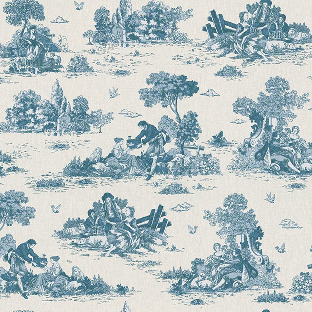 Classic Shepherd Scene Tyg i Half Panama Premium kvalitet. Detaljerat Toile de Jouy motiv i blå och beige nyanser. Oeko-tex certifierad. Idealisk för dukar, kuddar och gardiner. Toile de Jouy