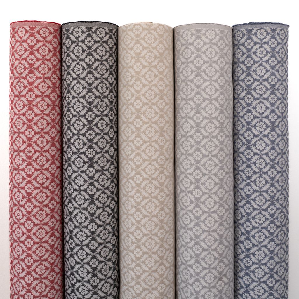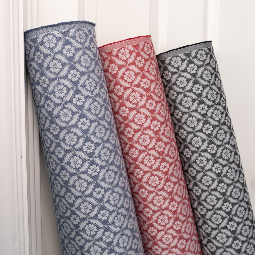 Ett vackert mönstrat bomullstyg som är vändbart, med motsatta färger på baksidan för extra variationsmöjligheter. Tyget är vävt i naturmaterial, vilket innebär att det kan förekomma mindre svart ludd i väven – en naturlig del av materialets karaktär. Passar utmärkt till gardiner, kuddar, dynor, stolsdynor och dukar.