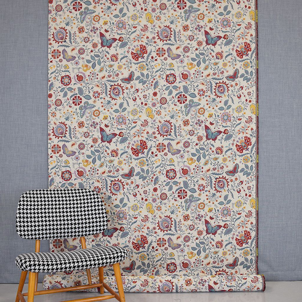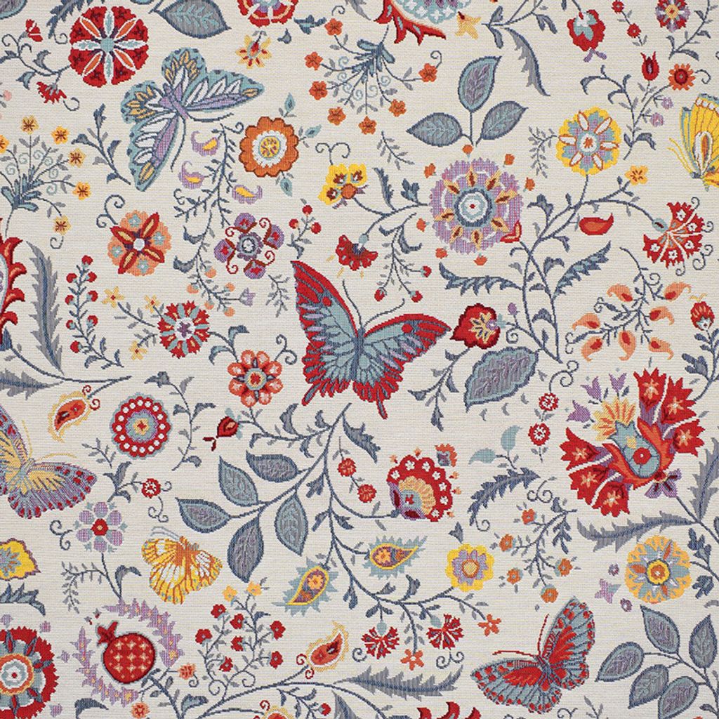 Multifärgat möbeltyg även kallar gobeläng tyg. Snyggt mönster med ljusbeige bottenBlommor och fjärilar