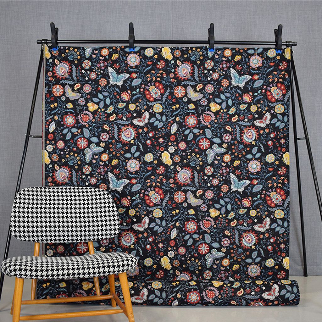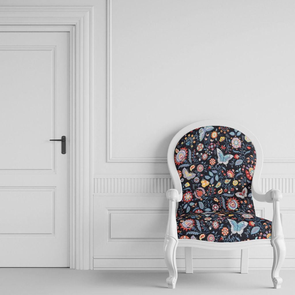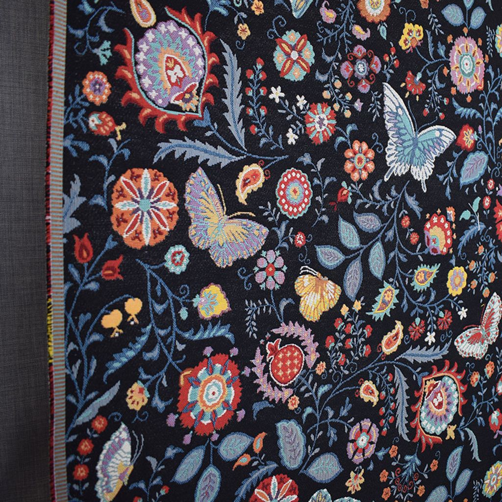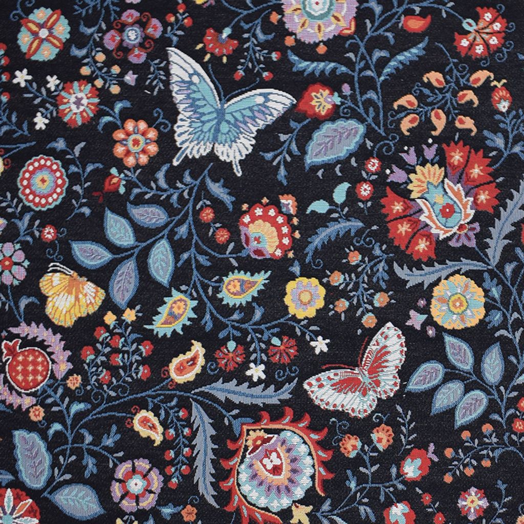 Möbeltyg med svart botten och fjärilar och blommor i pastelliga färger. Oeko-Tex standard 100