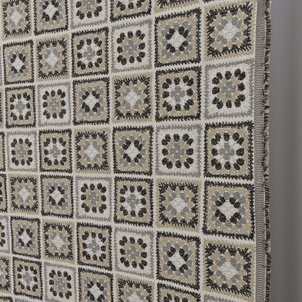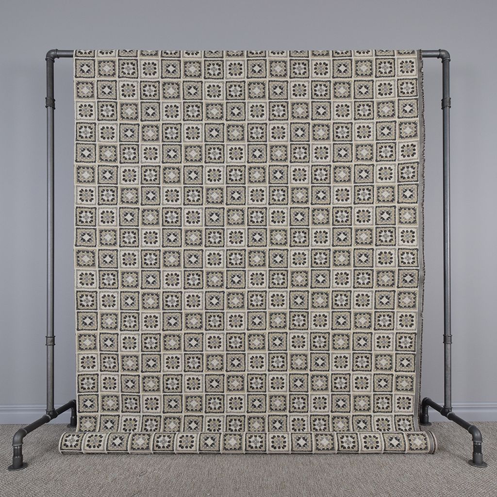 Beige, grått och svart mönster likt mormorsrutor, gobeläng tyg på metervara.