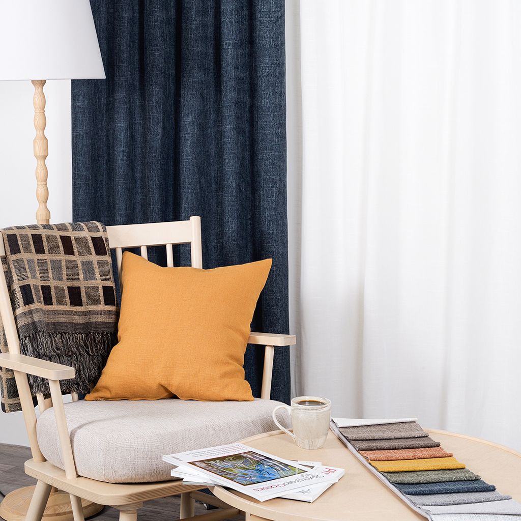 Cru blå är en stilren och exklusiv mörkläggningsgardin som förenar praktisk funktion med ett kraftfullt visuellt uttryck. Tygets rika och lätt melerade struktur ger gardinen ett levande djup och en taktil känsla som förhöjer helhetsintrycket i rummet.