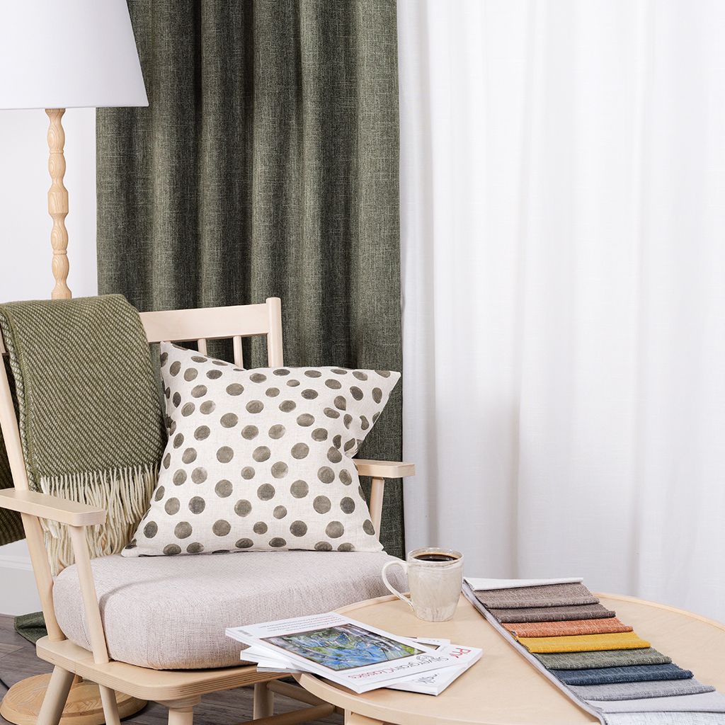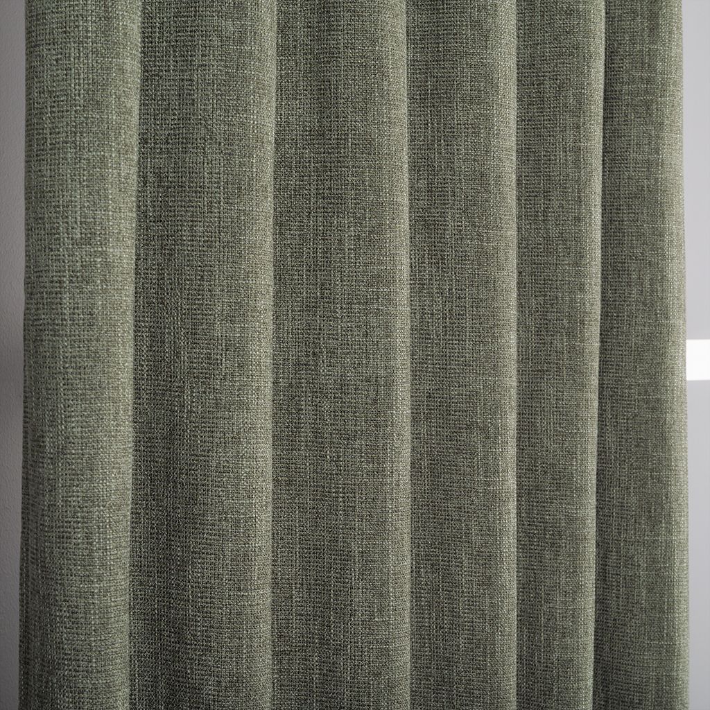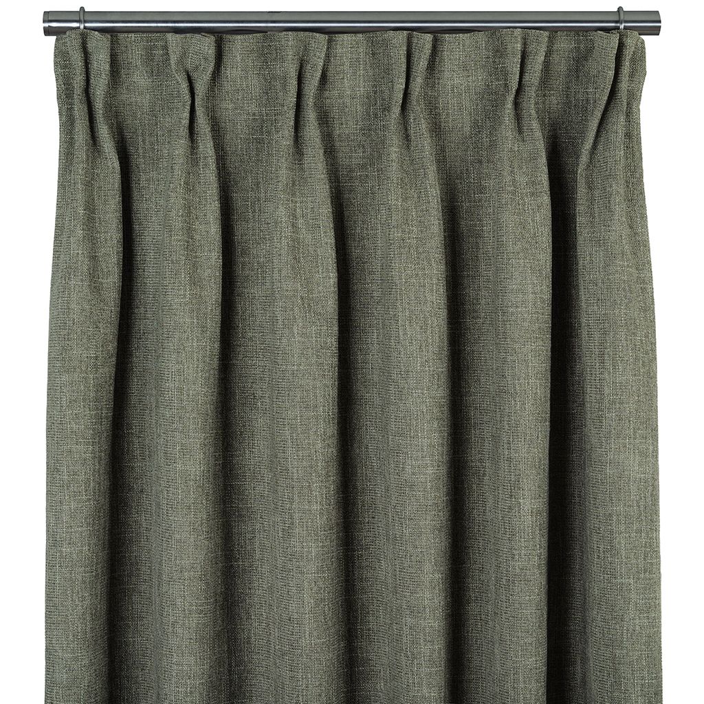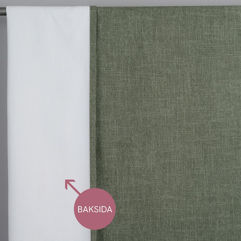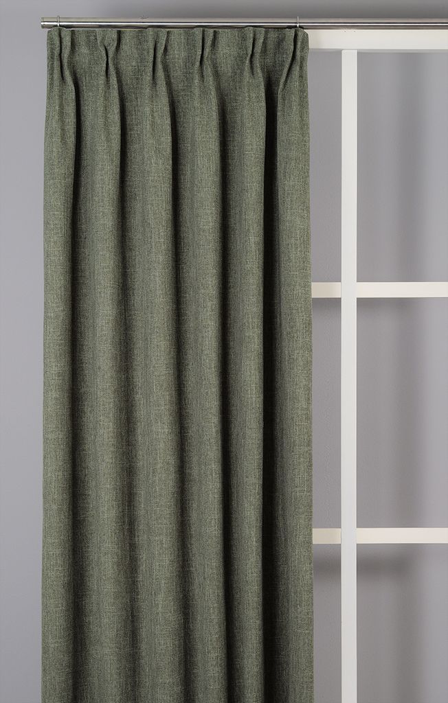 Cru grön är en 100% mörkläggande gardin med fyllig struktur och dov, elegant grön ton. En dekorativ och funktionell gardin som skapar en ombonad känsla och effektivt blockerar ljus. Ouppfållade med overlocksöm nedtill.