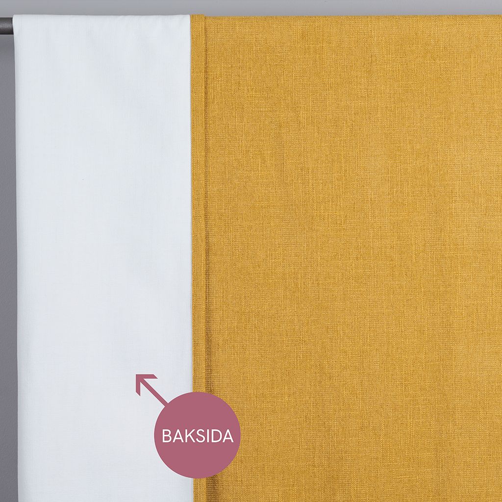 Cru ockra är en 100% mörkläggningsgardin i varm ockragul ton med fyllig, melerad struktur. Gardinen är 280 cm bred, dubbel bredd och säljs som 1-pack – perfekt för större fönster och ett generöst, elegant fall. Ouppfållade med overlocksöm nedtill.