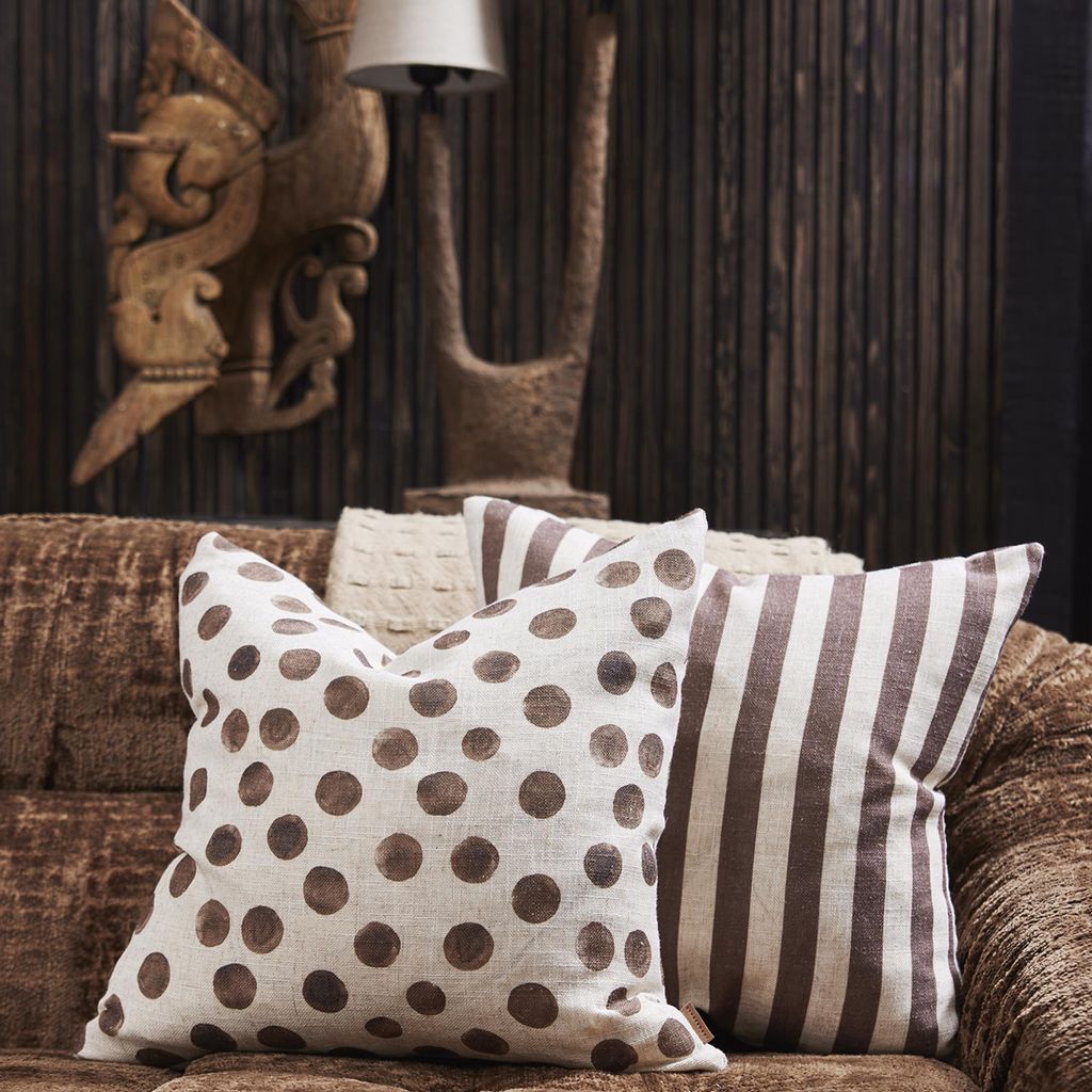 Cruella Dot brun kombinerar grafisk form med jordnära toner och skapar ett uttryck som känns både modernt och ombonat. De oregelbundna prickarna i varma bruna nyanser ger ett levande, nästan handmålat intryck mot den ljusa naturfärgade botten. Det gör kuddfodralet till en perfekt balans mellan lekfullhet och stilren design.