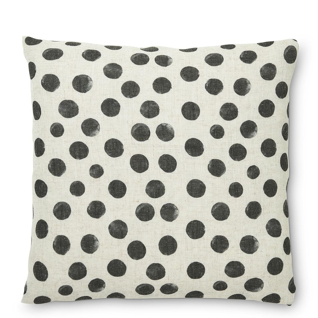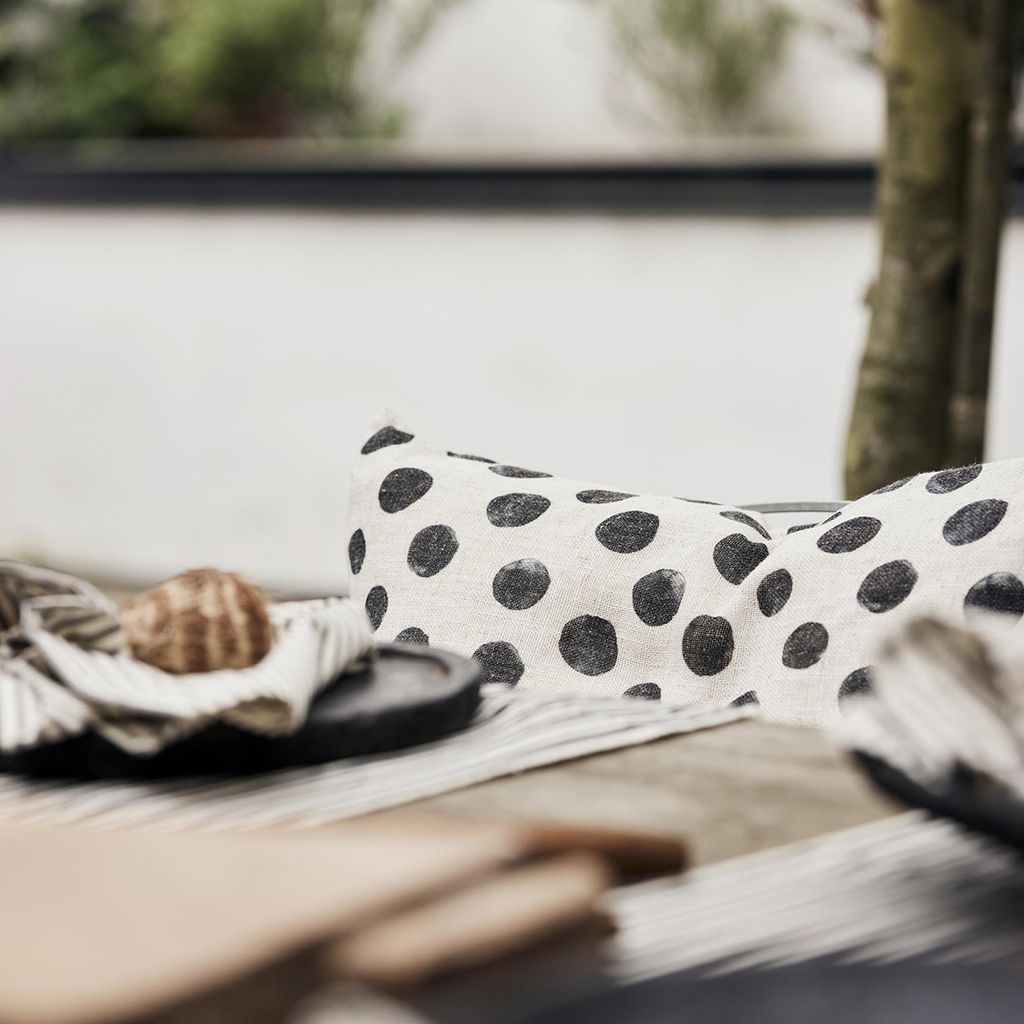 De oregelbundna prickarna ger ett mjukt och handgjort intryck som balanserar det grafiska uttrycket. Resultatet är ett kuddfodral som passar lika bra i ett minimalistiskt hem som i en mer bohemisk eller rustik miljö. Det är enkelt att matcha med enfärgade textilier, men fungerar också utmärkt tillsammans med ränder eller andra mönster för en mer dynamisk helhet.