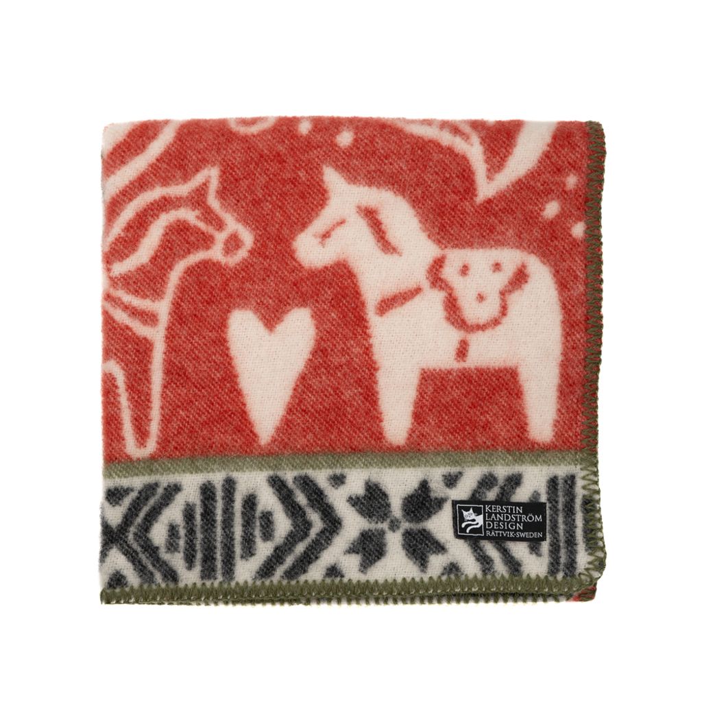 Barnfilt DALARNA i mjuk ekologisk ull med dalahäst-motiv som en hyllning till Sveriges kulturarv. Perfekt för vagnen, som lekmatta eller som en varm kram i sängen.