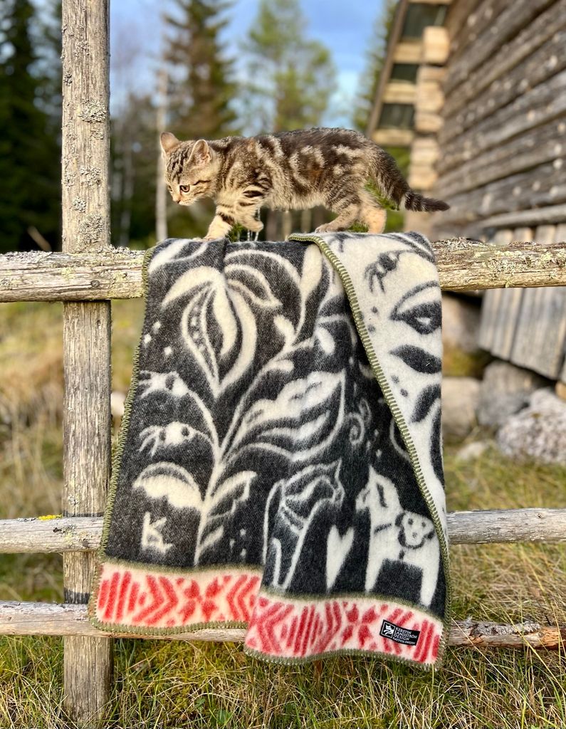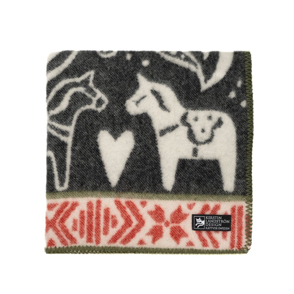 Den mindre ullfilten Dalarna svart är inspirerad av svensk allmogekultur och har därav sovit av dalahästar, kurbits och dräktband man kan se i Dalarnas vackra folkdräkter.