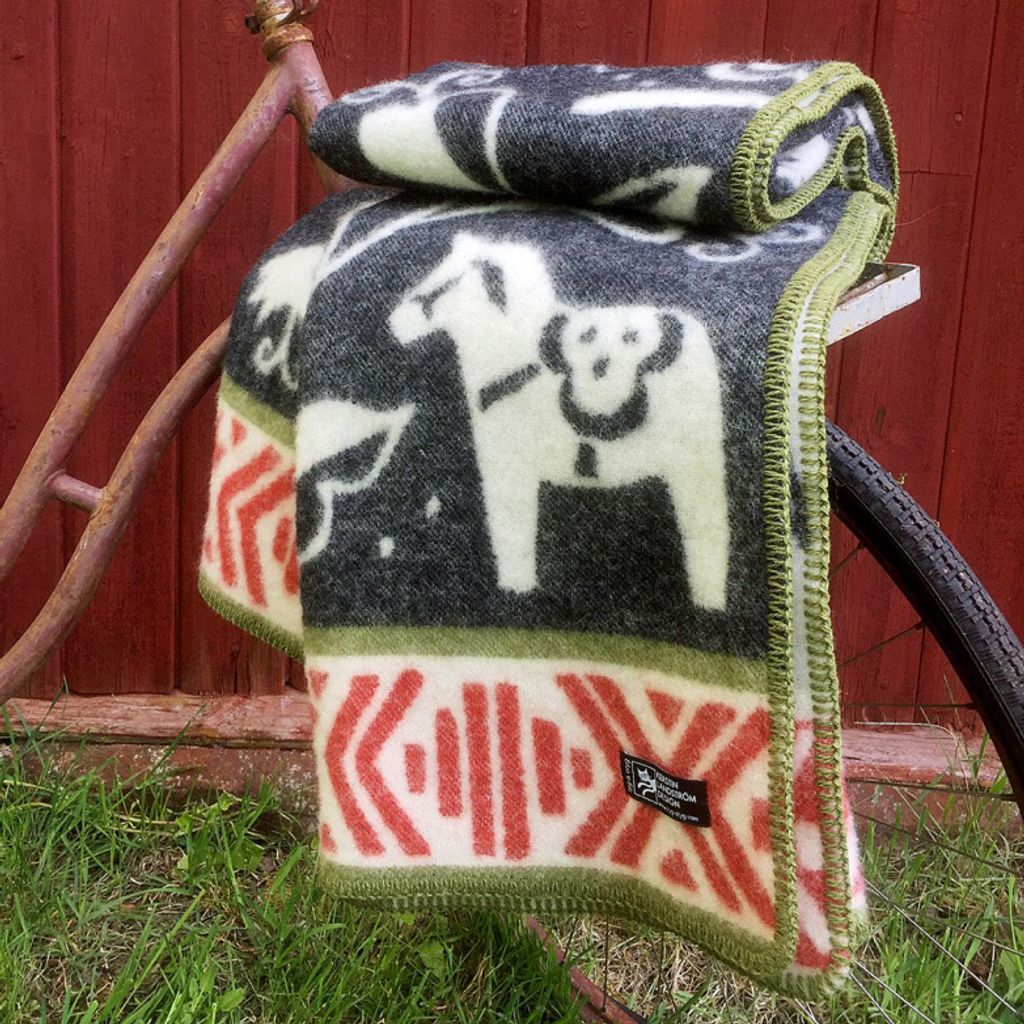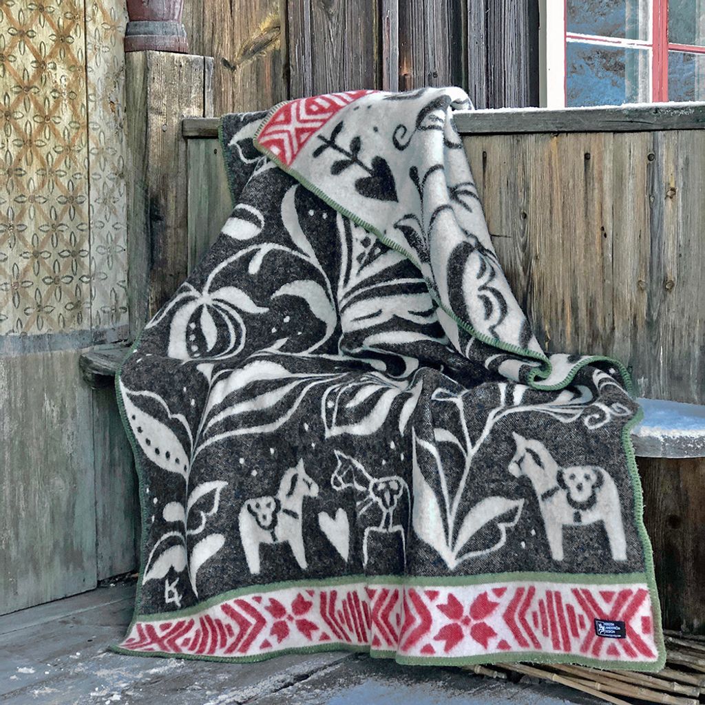 Ullpläden DALARNA är inspirerad av svensk allmogekultur och har därav sovit av dalahästar, kurbits och dräktband man kan se i Dalarnas vackra folkdräkter.