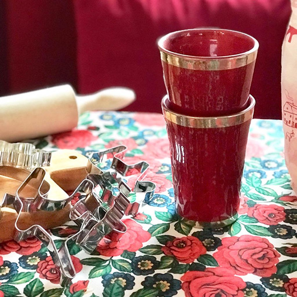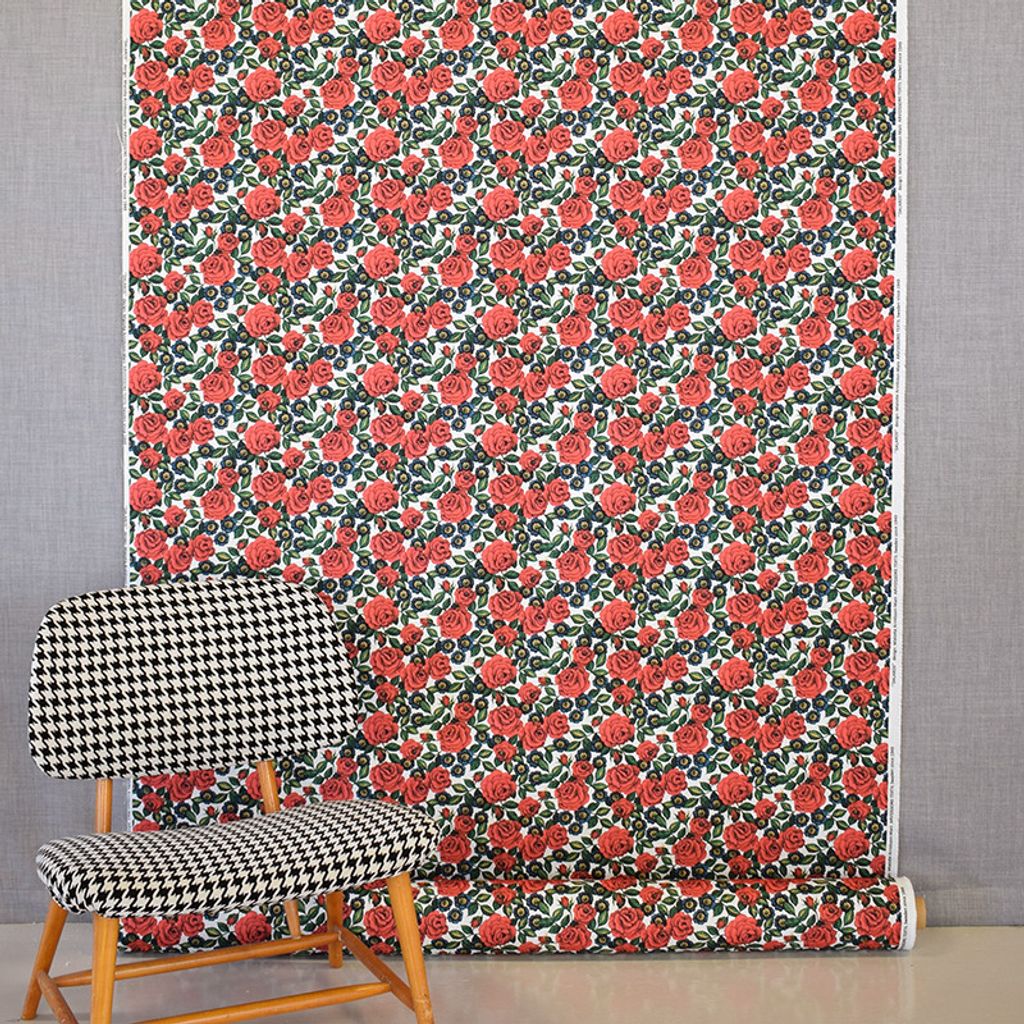 Bomullstyg med Dalarosor på vit botten. Mönstret är handritat av Mialotta Arvidsson-Mars exklusivt för oss på Nordisk Textil