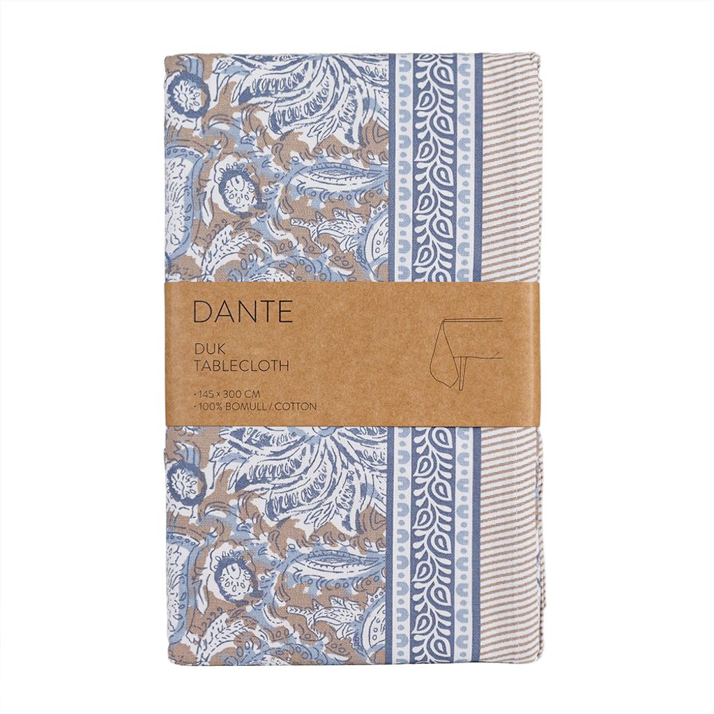 Dante är en uttrycksfull bordsduk i en harmonisk blå färgskala med inslag av naturtoner som skapar ett lugnt men levande helhetsintryck. Det detaljrika mönstret ger duken karaktär, medan de dekorativa bårderna och diskreta ränderna ramar in designen på ett balanserat och genomtänkt sätt.