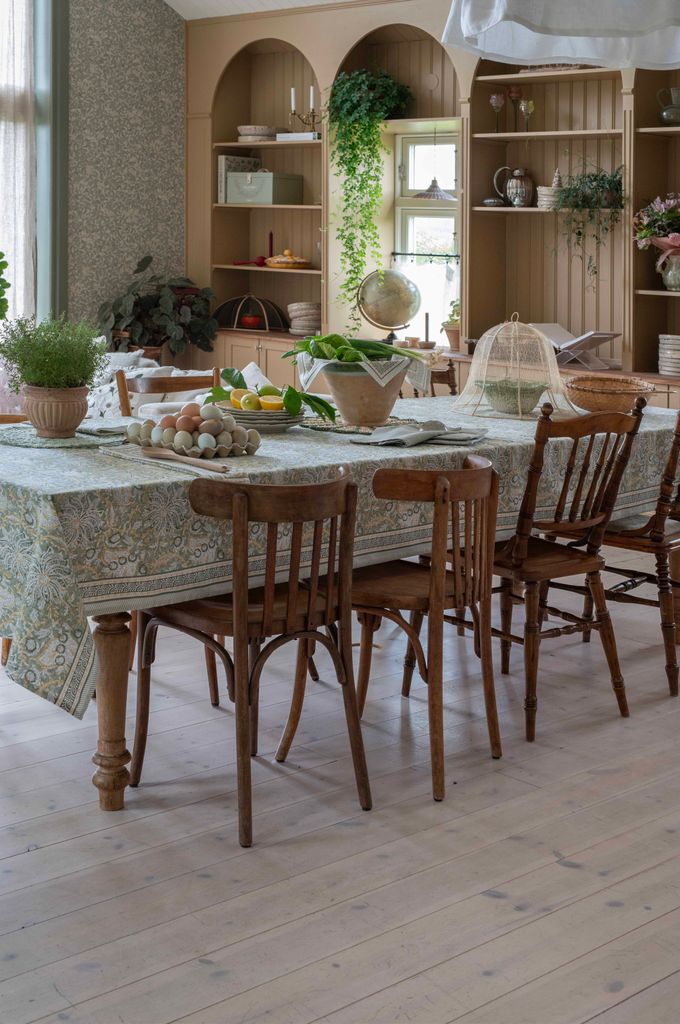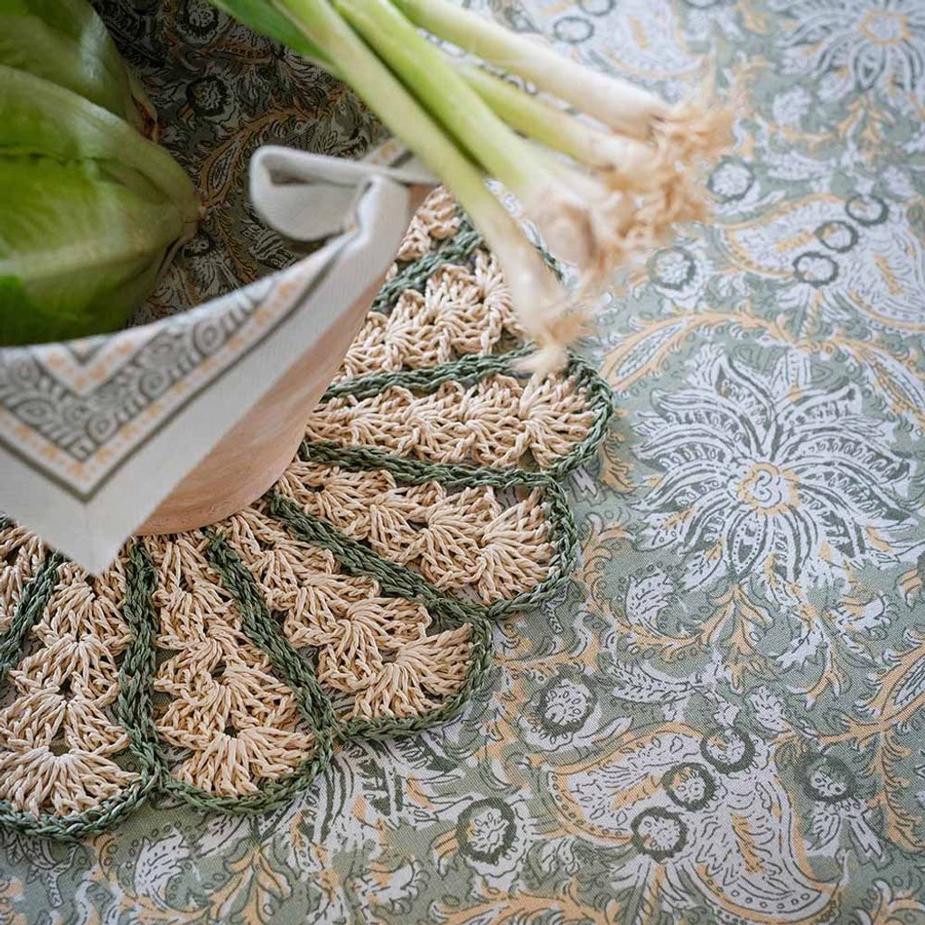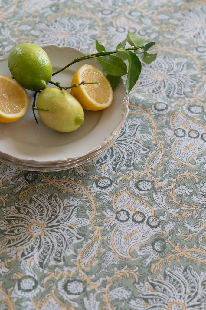 Dante är en uttrycksfull bordsduk i en mjuk grön färgskala med inslag av varma gula och ljusa toner. Det detaljrika mönstret skapar ett levande men balanserat uttryck som passar perfekt för dig som vill duka med färg och karaktär, samtidigt som helheten känns harmonisk.